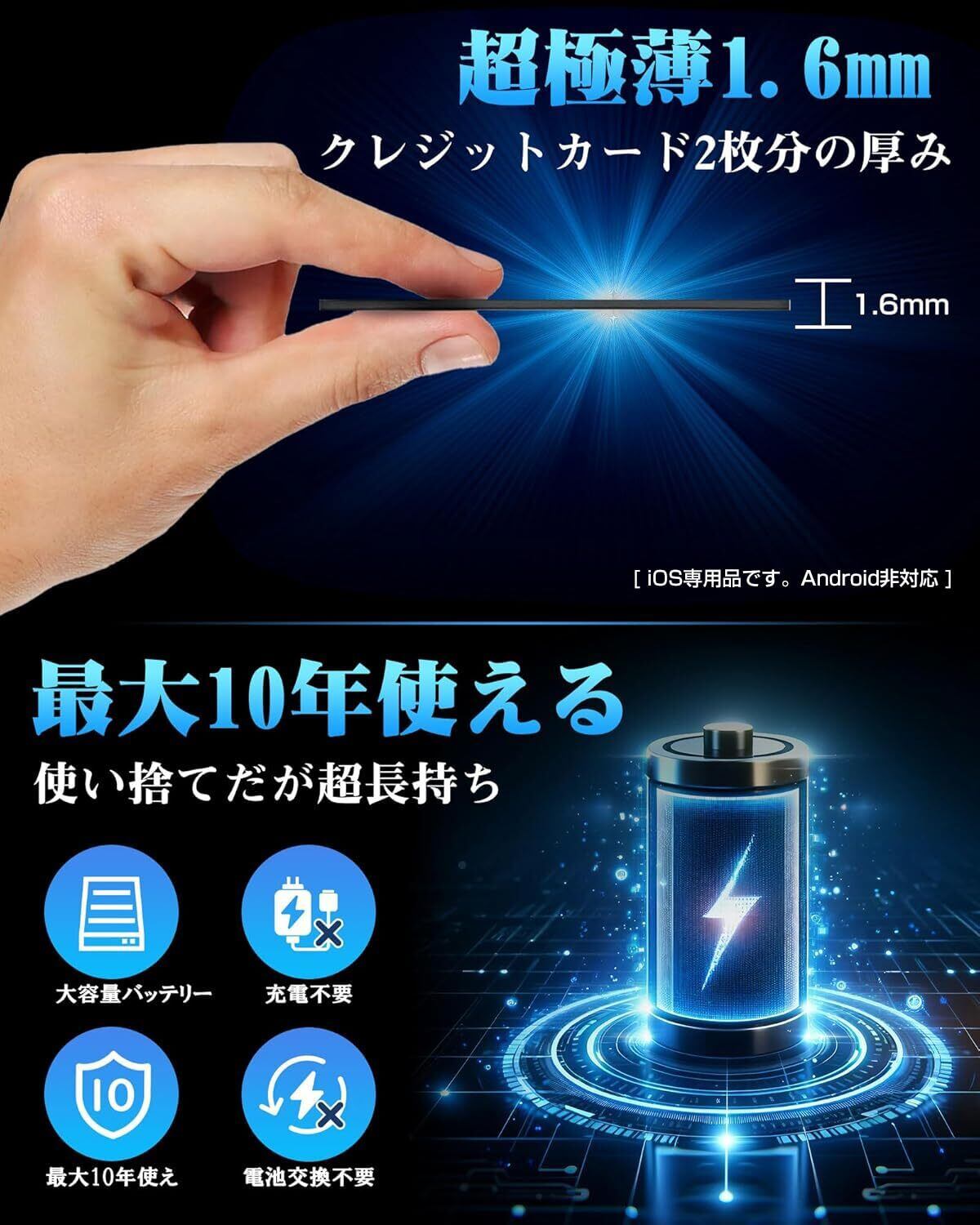 【超高性能 紛失防止タグ!】従来品・市販品と比較!Dyoac Finder Cardを選ぶ理由>>(1)充電不要!電池交換不要!使い切りスマートタグの中でもっとも長持ち!(2)業界最薄のgpsタグ!厚み僅か1.6mm!(3)IP68最高レベルの防水防塵性!水洗いOK!(4)100dB大音量ブザー搭載!(5)MFi&Telec認証済み!Apple「探す」に対応!(6)丈夫で折れにくい仕様!※本品はiOS専用です。アンドロイドに対応しておりません。【最大10年使える!】長持ちバッテリーと省電力技術を採用。使い捨てタイプの中でもっとも長持ち。電池交換・充電の手間がかかりません。お財布、貴重品の忘れ物防止、犬や猫の追跡、子供、高齢者のお見守り、車やバイクの位置確認や盗難防止など、様々なシーンに役立ちます。※バッテリーの消耗は使用環境、音を鳴らす頻度などによって異なる場合があります。