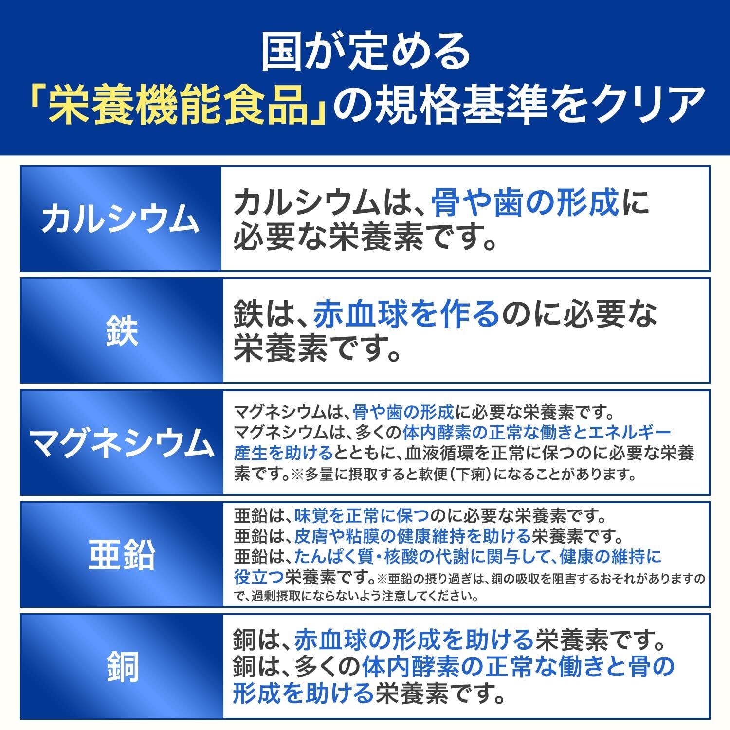 【栄養成分表示[3粒1350mgあたり]】熱量1.8kcal、たんぱく質0.04g、脂質0.03g、炭水化物0.33g、食塩相当量0.04g、カルシウム250mg(37)、鉄7.5mg(110)、亜鉛6.0mg(68)、銅0.6mg(67)、マグネシウム125mg(39)、セレン30.2μg、クロム28.3μg、マンガン1.5mg、ヨウ素50.8μg、モリブデン10.5μg