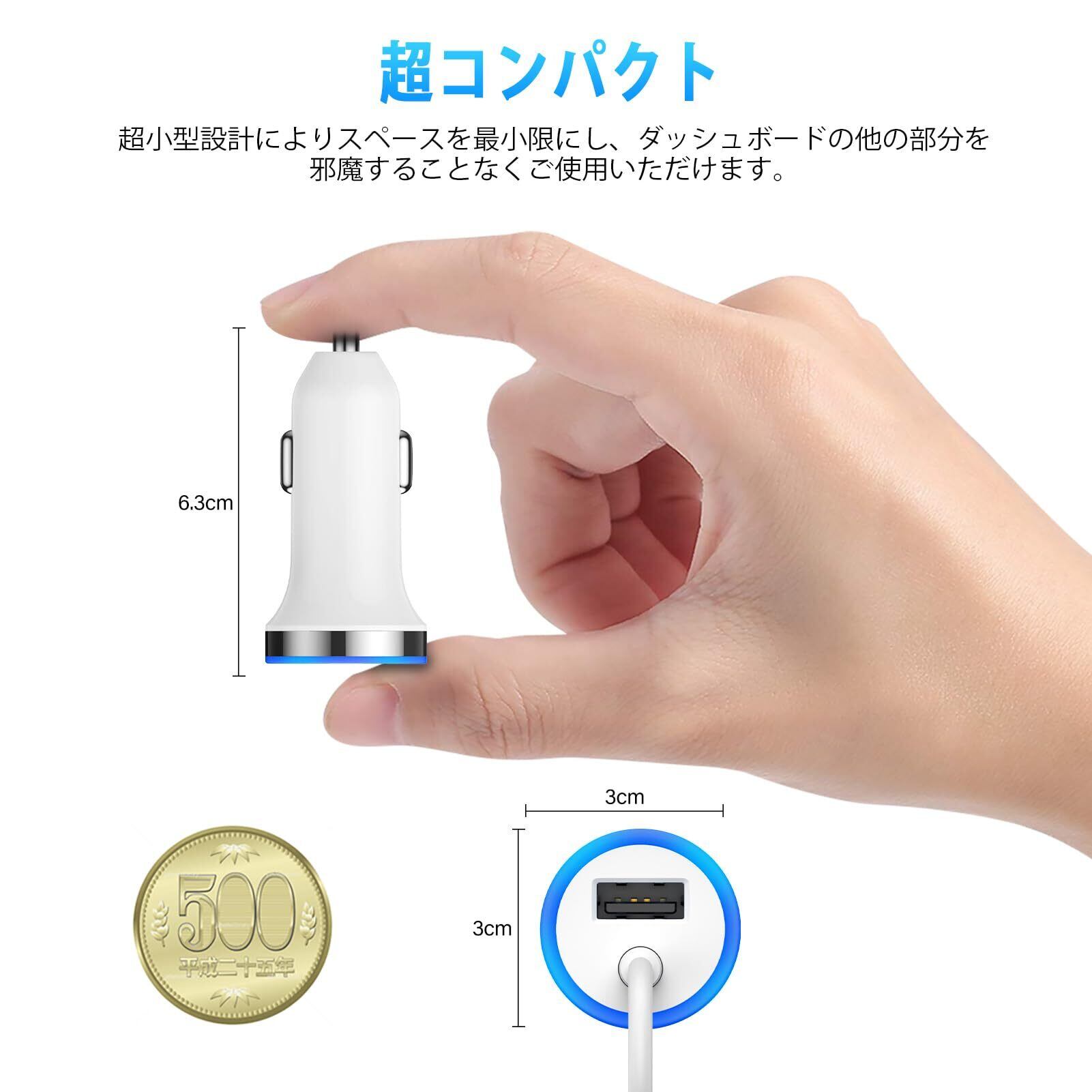 【安全・安心の車載充電器 】USB車充電器の外形寸法:68×30×30mm、重さ:約40g。超軽量化・コンパクト化を実現し、シガーソケットに装着しても運転の邪魔にならないミニサイズの車の充電器です。運転中の電圧変動も自動で調節でき、いつまでも安定した電圧を供給しています。更に、充電保護システムより、過充電、過放電、過熱を防止し、お使いの機器をしっかり守ります。