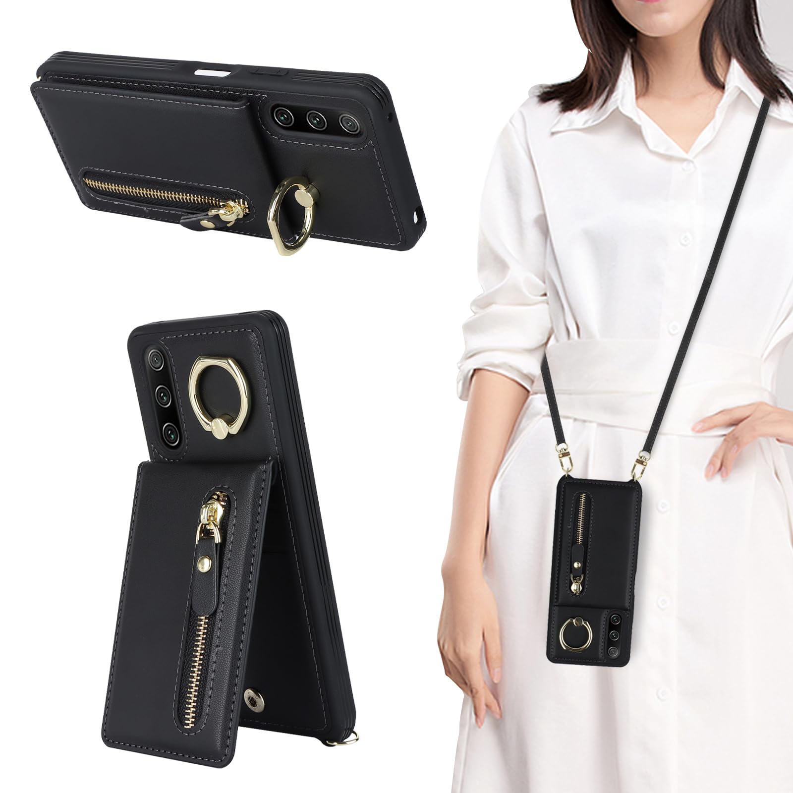 Xperia 10 IV ケース ショルダー リング付きケース ストラップケース ショルダーケース 背面フリップ カードケース 上下開 手帳型 エクスペリア xperia10 4 xperia10 マーク4 au SOG07 docomo SO-52C SoftBank 適用 CASE iCoverCase リング付き カードケース ブラック