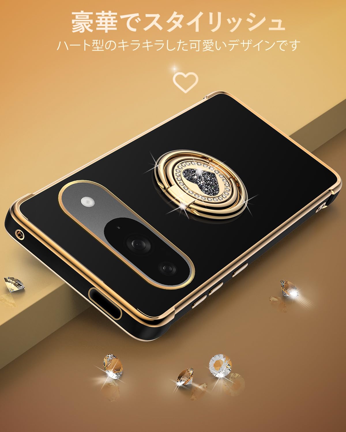 Rockaway Google Pixel 9 用 ケース ダブルリング付き ショルダー ストラップ付き 耐衝撃 薄型 軽量 紐付き 肩掛け 斜めかけ かわいい 女の子 おしゃれ スマホケース ピクセル9 カバー - ブラック