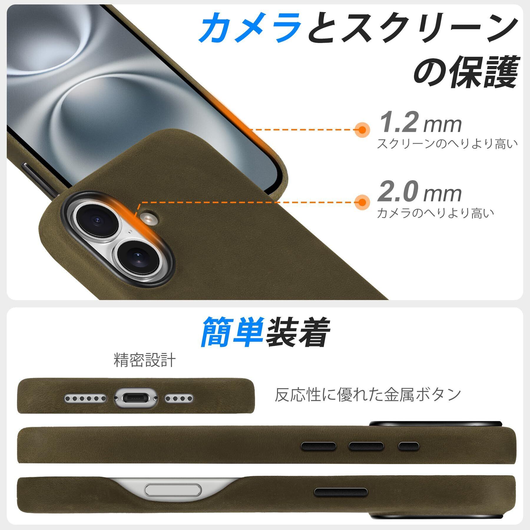 SHIELDON iPhone16Plus対応 本革 ケース ワイヤレス充電対応 磁気充電可 ベーシックケース クレイジーホースレザー 背面保護 あいふぉん16 Plus 対応ケース スマホカバー 滑り止め 指紋防止 カメラ保護 携帯便利 アイホン16 プラス 対応 スマホケース 2024年発売 6.7インチ対応 5G クレイジーホース-カーキ
