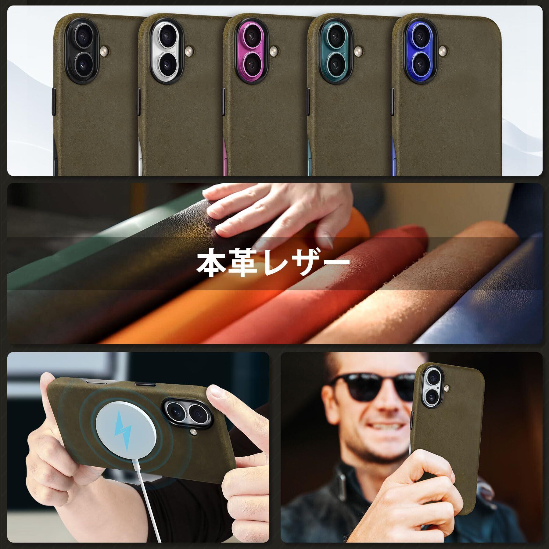 【在庫セール】SHIELDON iPhone16Plus対応 本革 ケース ワイヤレス充電対応 磁気充電可 ベーシックケース クレイジーホースレザー 背面保護 あいふぉん16 Plus 対応ケース スマホカバー 滑り止め 指紋防止 カメラ保護 携帯便利 アイホン16 プラス 対応 スマホケース 2024年発売 6.7インチ対応 5G クレイジーホース-カーキ