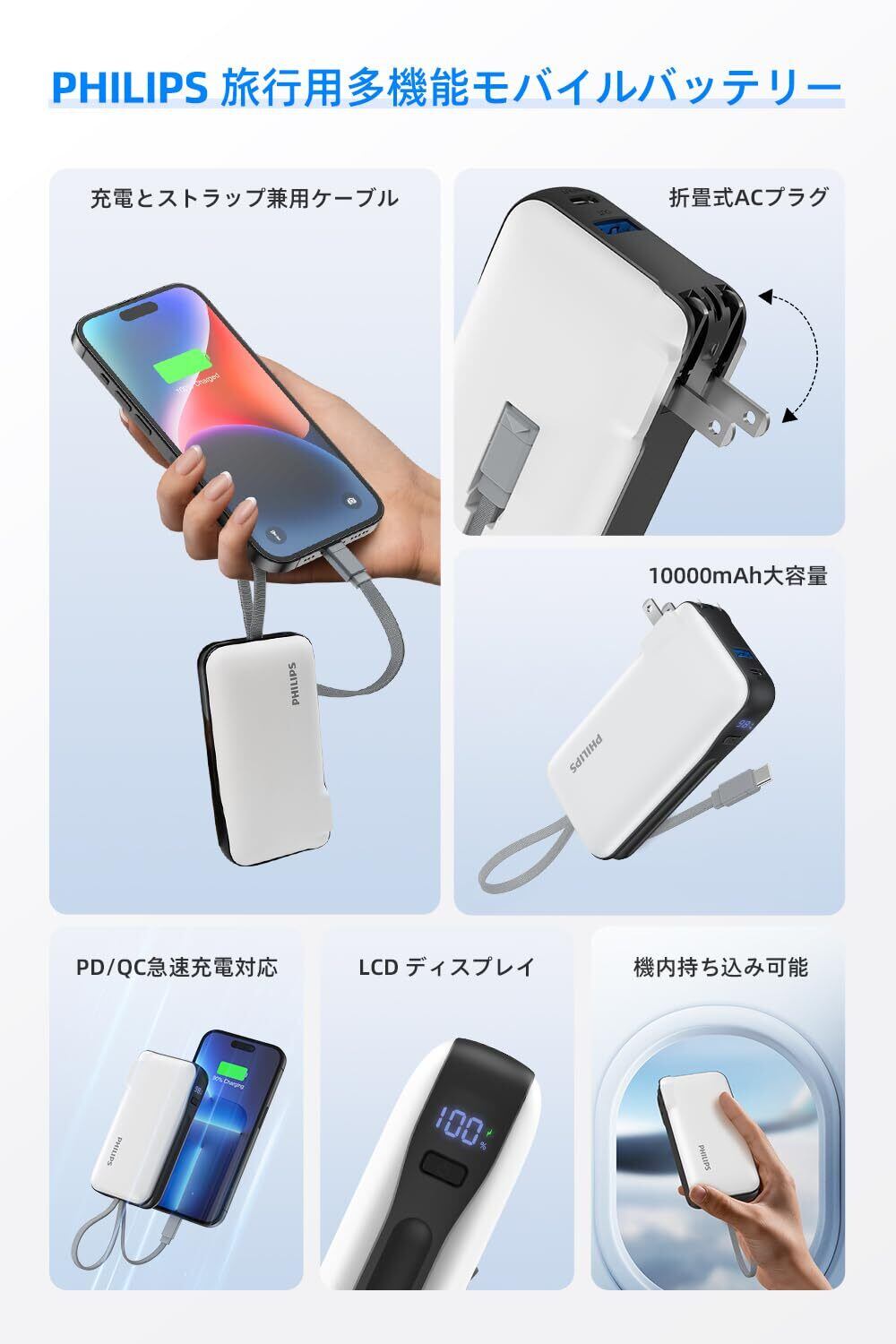 Philips(フィリップス) モバイルバッテリー コンセント一体型 10000mAh ACプラグ付き 大容量 携帯充電器 PD 20W出力 3台同時充電 折りたたみ式/Type-Cケーブル内蔵/パススルー機能/ディスプレイ搭載/アダプター変換可能 PSE認証済 ホワイト DLP4350CW
