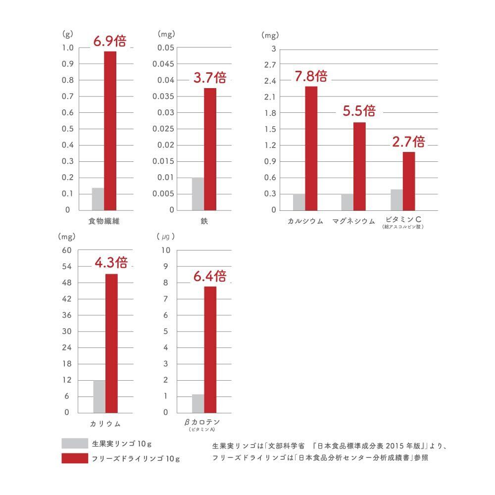 【美味しさと栄養がぎゅっと詰まったリンゴ】リンゴの果肉をそのままフリーズドライにしました。 果肉のビタミン・ミネラル等の栄養素が凝縮され、 生の状態と同じ量で比較すると食物繊維や鉄、カルシウム、ビタミンA、ビタミンCなどの栄養素が圧倒的に多くなります。