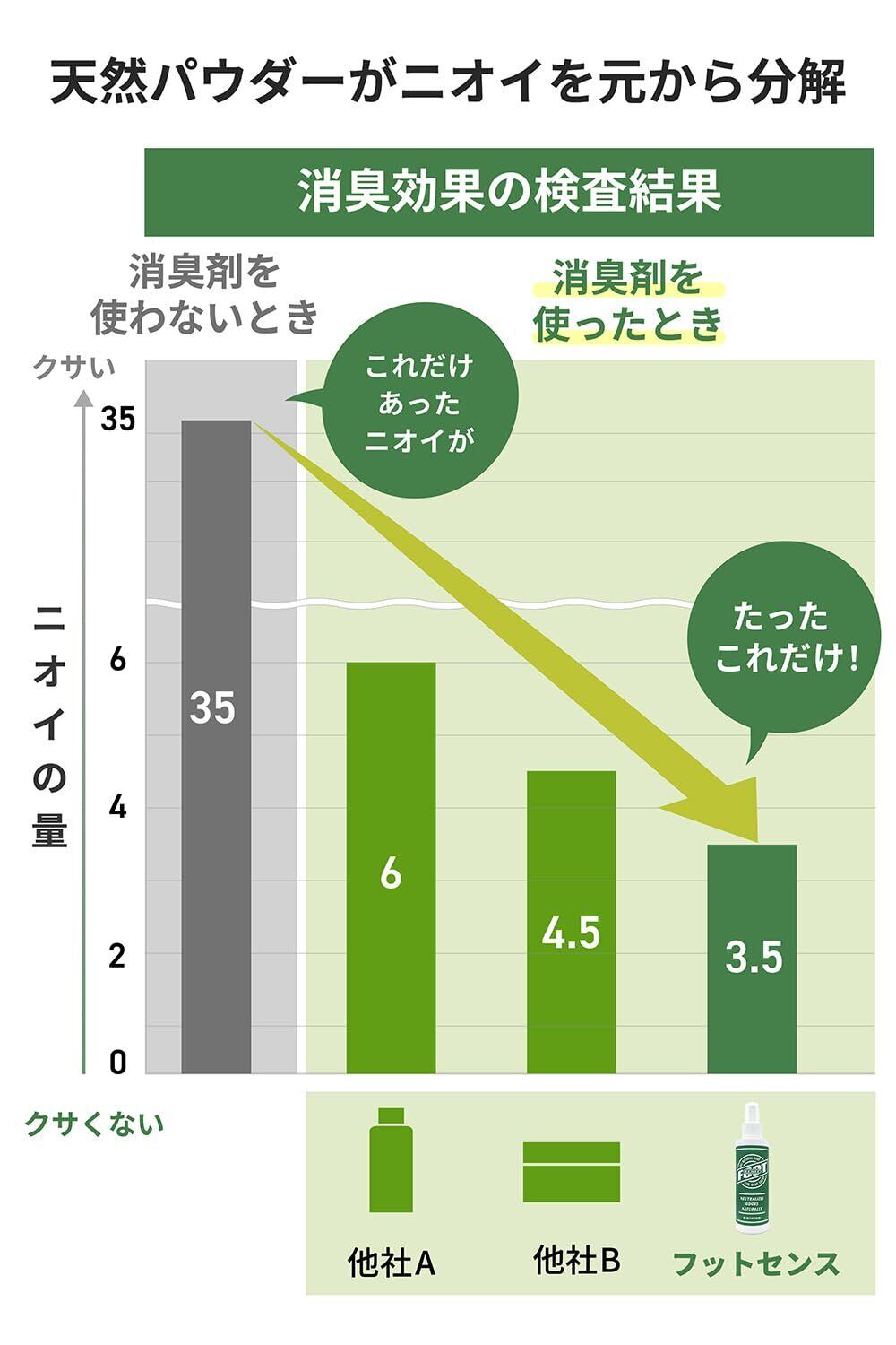 【 天然スプレーがニオイを分解 】 実際の効果を第三者機関で、検査しました。検査の結果、他社の9倍の消臭力が認められました。消臭パウダーを振りかけておけばOK。抗菌&足の匂い対策に。
