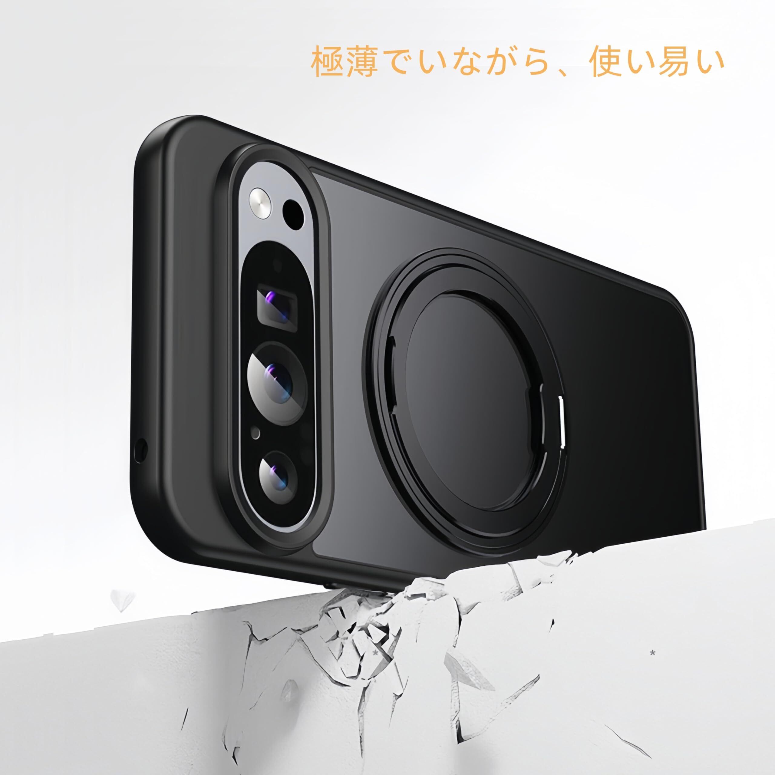「360°Magsafe対応スタンド&ワイヤレス充電」リング丸には磁石のマグセーフ搭載、グーグルピクセル9プロ XLケース装着時の磁力がアップし、MagSafe式の充電器やアクセサリとの安全なロックが保証されます。差し込みのいらないより簡単により素早く充電できます。