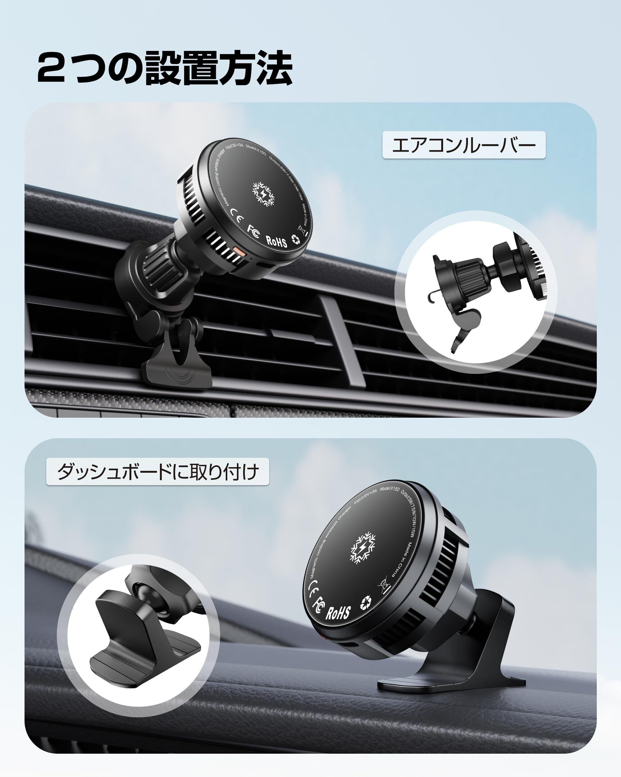 [冷却機能付き・ペルチェ素子採用]本製品は冷却機能付きの車載ワイヤレス充電器です。冷却方法はペルチェ式を採用しており、わずか3秒で瞬間冷却、さらに円形の接触面が冷却拡散効果を最大化します。長時間のご使用でも安定した充電が可能で、特に夏場の車内や長距離ドライブの際に大変便利です。車中でナビゲーションシステムを使用や充電時に発生しやすい発熱による、スマホのフリーズ・画面のラグ・操作反応の鈍さ・CPU及びバッテリーの消費などを効果的に防げます。