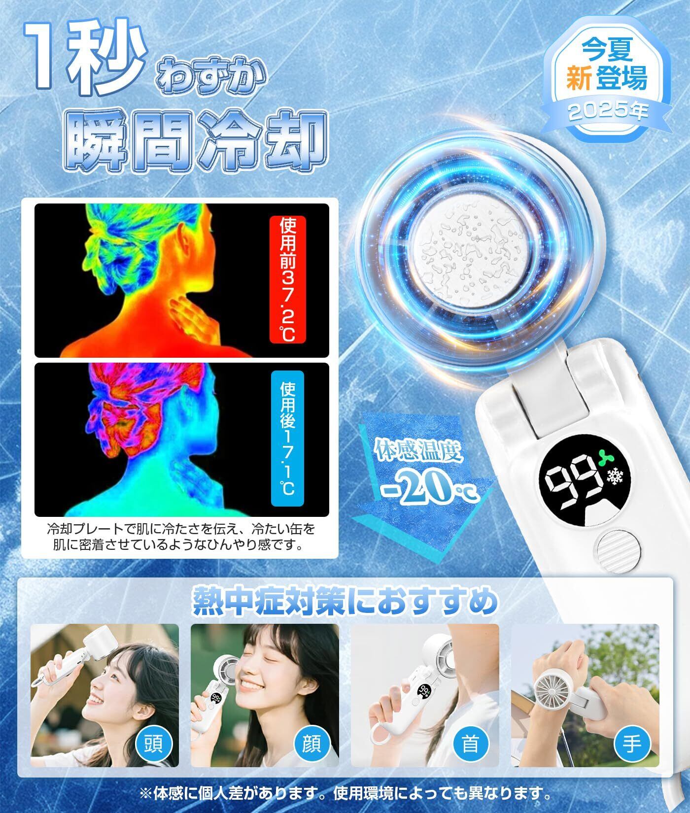 【-20℃瞬間冷却・1秒でひんやり!熱中症対策に最適】2025年夏の熱中症予防に最適な冷却プレート付きハンディファンです。高性能冷却プレートを搭載したこのハンディファンは、冷却ボタンを3秒長押しするだけで冷却モードに切り替わり、火照った肌に当てれば氷のような極冷感が瞬時に体感できます。通常の携帯扇風機とは異なり、酷暑の中でも体感温度を急速に低下させ、1秒で爽快なひんやり感をお届け。通勤・通学から、街歩き、スポーツ観戦、花火大会、夏祭り、野外フェス、ライブ、キャンプ、旅行まで、あらゆる夏のアウトドアシーンで大活躍。灼熱の夏を快適に過ごすための必須アイテムです!