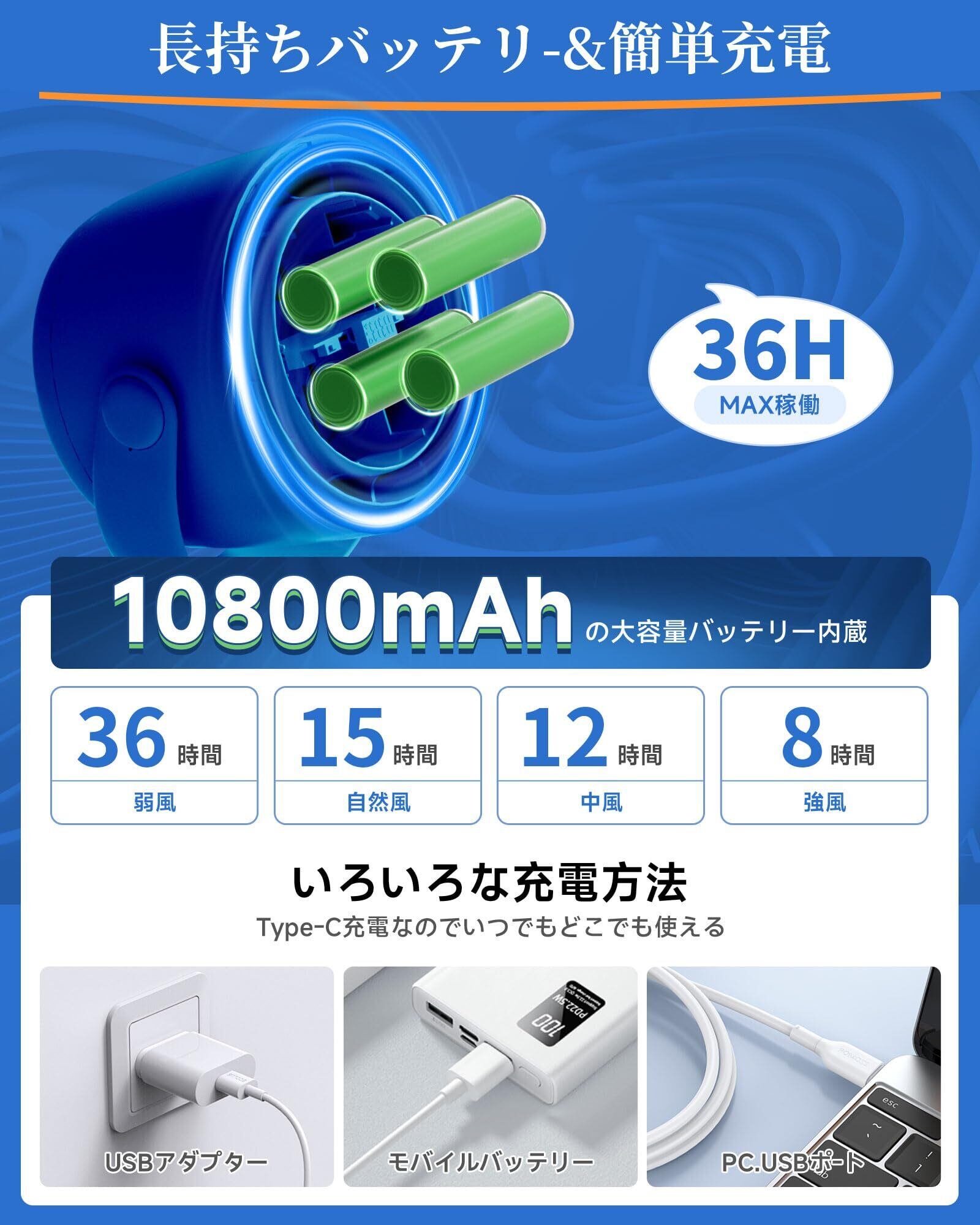 【爽やかさ持続・充電切れフリー】10800mAh大容量バッテリー内蔵で最長36時間の爽やか風(弱風時)を持続可能。充電の手間が少なく、朝から晩まで涼しさをキープ。Type-C急速充電対応なので、幅広いデバイス対応で、ACアダプター、PC、モバイルバッテリーからも手軽に充電OK