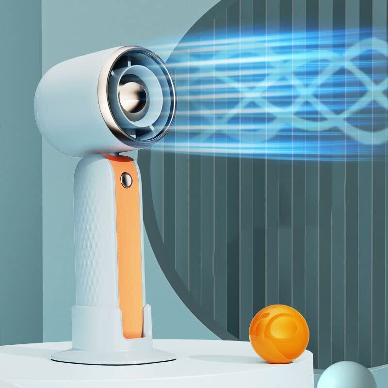 【手持ち/卓上扇風機とミニサイズ】 このミニポータブル扇風機は滑り止めの質感があり、屋外では手持ち扇風機として、またオフィスではミニ卓上扇風機として使用できます。 ベースの シェル デザインにより、ファンを傾けて配置することができ、風角度はデスクトップでの使用により適しています