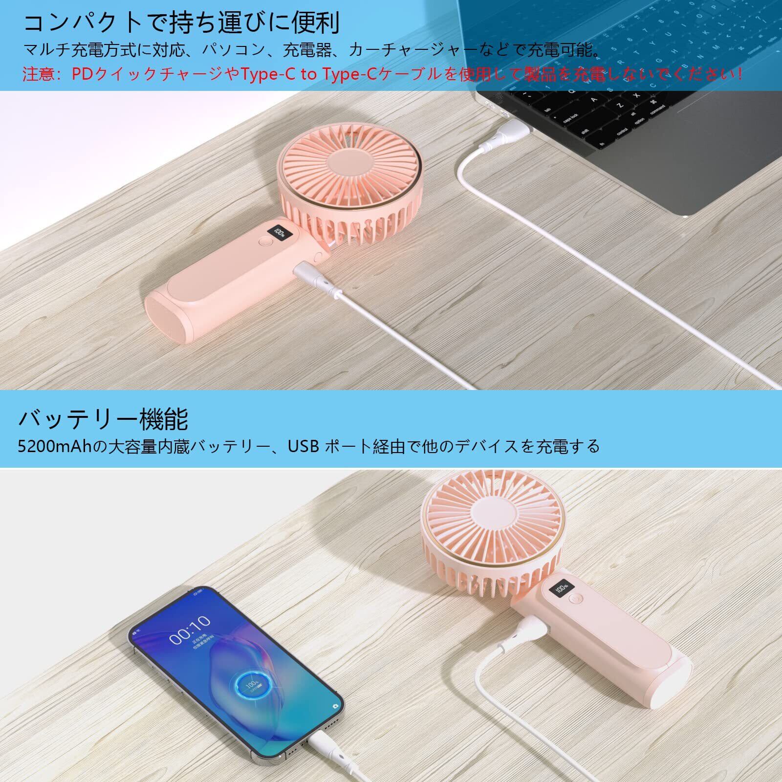 【5200mAh大容量バッテリー・デジタルディスプレー】この手持ち扇風機には5200mAhの大容量バッテリーが搭載されており、最大20時間の連続使用が可能で、快適な風を長時間楽しめます。複数の充電方式をサポートし、パソコンや充電器、モバイルバッテリーを使用して、Type-C充電ポートを介して扇風機を充電でき、送風しながら充電も可能で、お出かけ時も安心です。さらに、スマートフォンやその他のデバイスを充電するための小型モバイルバッテリーとしても使用します。扇風機の風量と電力はデジタルディスプレイでいつでも表示できるため、充電が必要な時期をすぐにわかります。【注:PD充電器とType-C to Type-Cケーブル非対応です。】