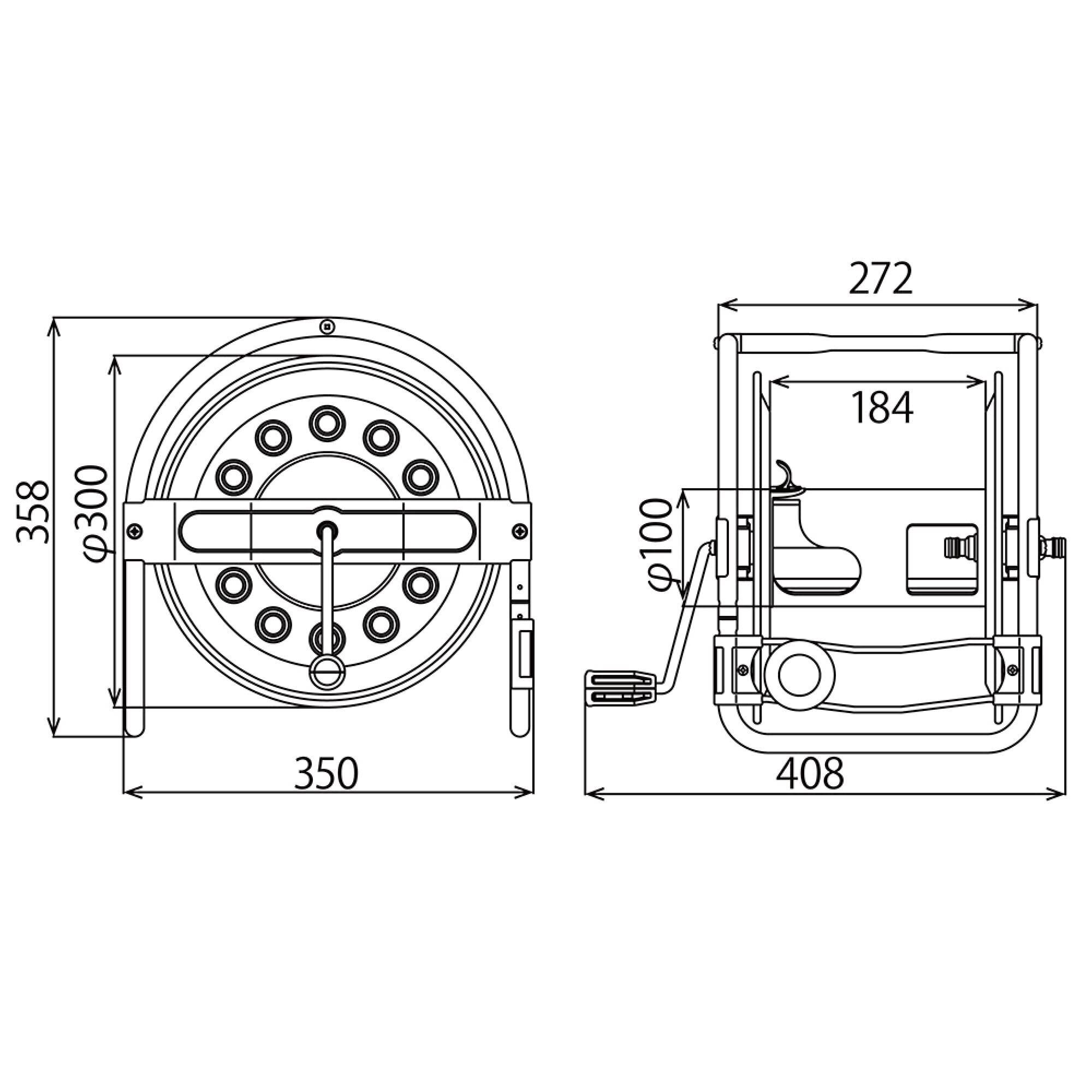 その他特長:丈夫なステンレス製、耐寒・耐圧に優れた網入防藻ホース付、一次側ホース接続部はワンタッチニップル付、ホースの巻き取りがラクな大型ハンドル付、ホース巻き取り新機構「コロコロガイド」付、ドラム下方向巻き込みタイプ