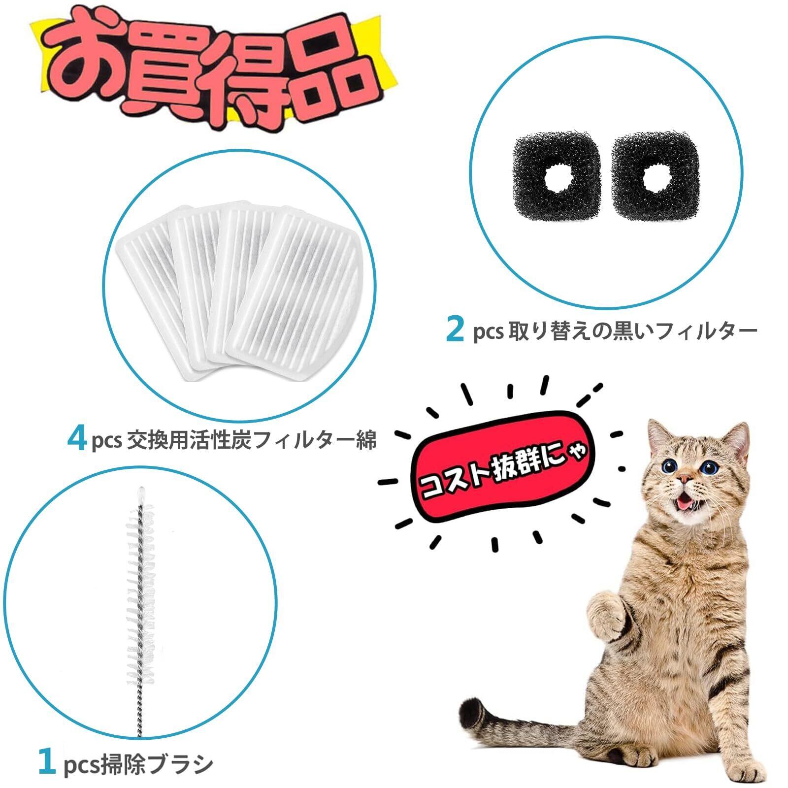 【2パターンの給水モード】ペットの興味をそそる蛇口モードとソロソロと流れる湧水モードを設定することができる水飲み器です。お水が湧き水のように流れ、水と空気の接触面積が広いので水に酸素を補充するという効果があります。水はおいしくなります。 活性炭フィルターは猫の毛や埃等の不純物が濾過されてます。水をきれいに保ってます。