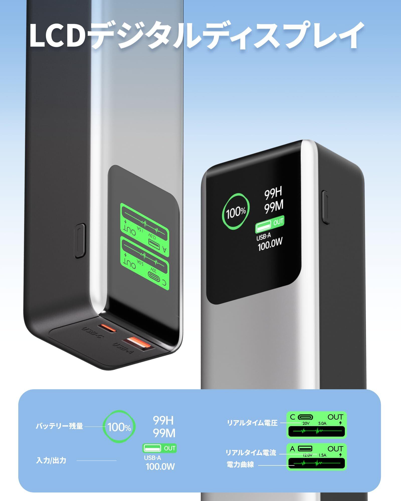 ✈️【100W急速充電対応、PD3.0 および QC4.0 互換】当社のモバイルバッテリーは、、高性能な急速充電機能を備えています。100W PD の強力な出力で、iPhone 15 を 30 分以内に 65% まで充電することができ、MacBook Pro 16 インチも 35 分以内に 50% まで迅速に充電できます。小型機器にも対応しており、イヤホンやスマートウォッチなどを安全かつ効率的に充電することが可能です。さらに、ボタンをダブルクリックするだけで、付属のアプリが開き、電圧や電流の変動をリアルタイムで監視することができます。これにより、充電状況を常にコントロールし、安心してご使用いただけます 。