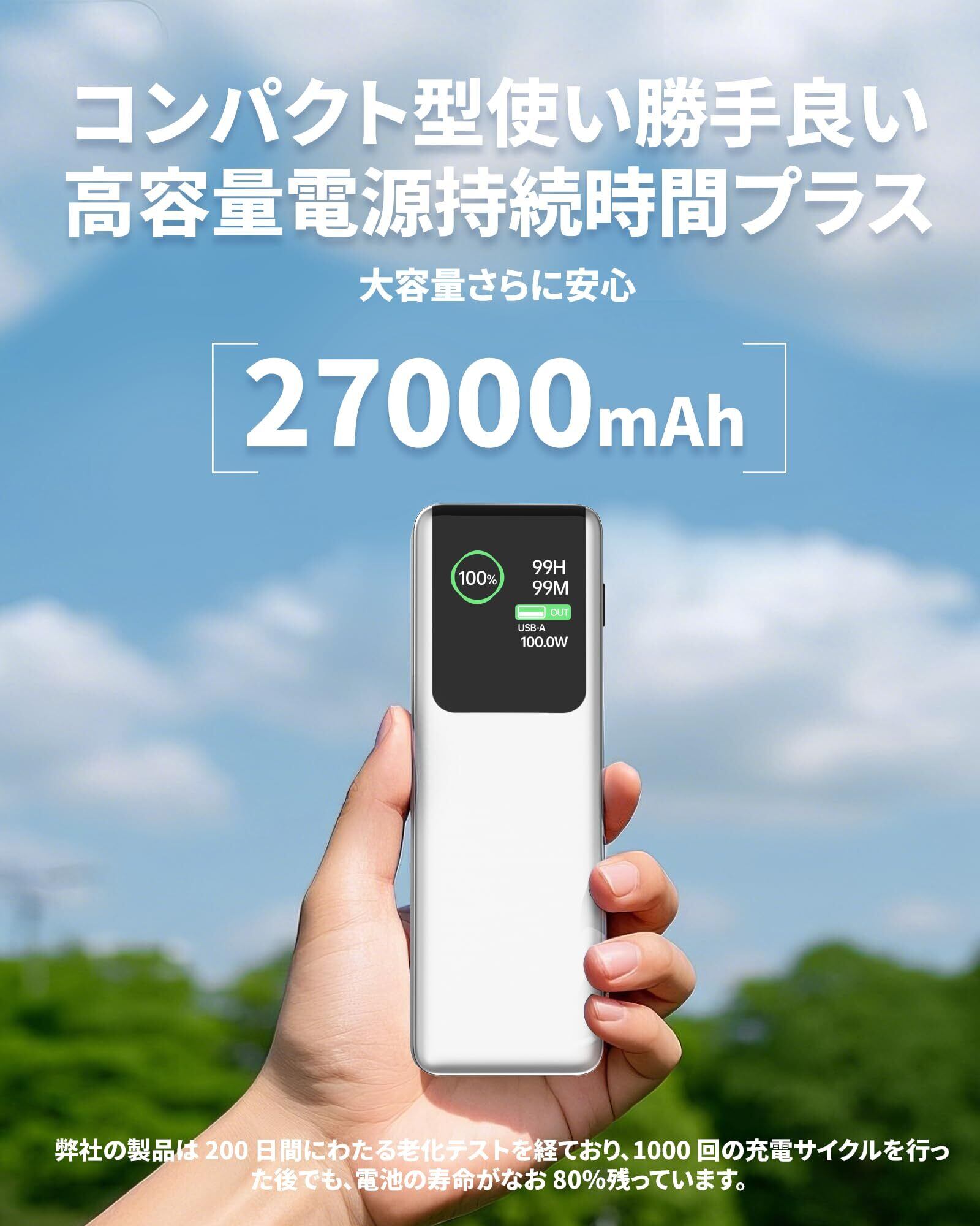 【27000mAhの超大容量、驚異的な充電能力】当社の革新的なモバイルバッテリーは、27000mAhという超大容量を備えています。この充電力は抜群で、iPhone 15 を約 4.6 回、MacBook Pro でも約 1.6 回充電することが可能です。外出時に充電切れの心配を一掃し、常に安定した電力供給をお届けします。また、当該モバイルバッテリーは国際航空の基準を完全に満たしており、飛行機の旅の際にもスムーズに持ち込みが可能です。