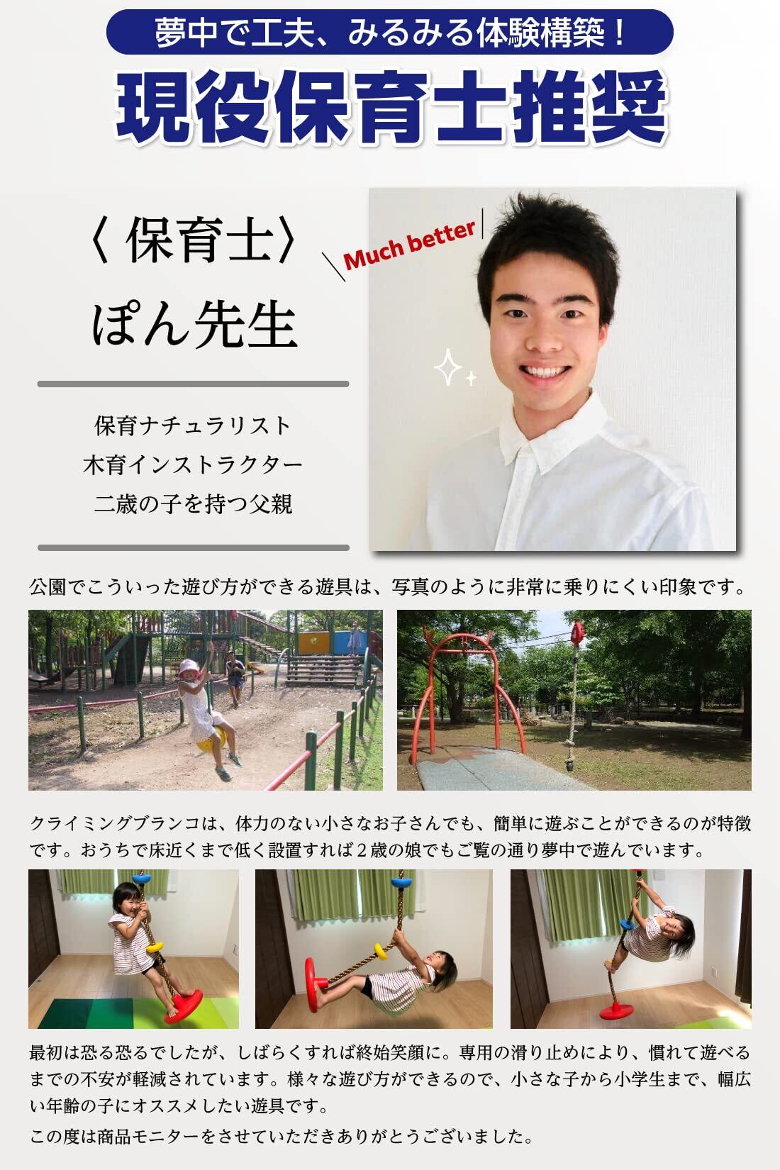 特徴 : ロープクライミング & 立ちこぎ 円盤ブランコ 遊び ! 握力 のみならず 脚力 及び 全身 の 筋力アップ や トレーニング に最適。ブランコにも縄登りにもなる仕様が お子様 の 想像力 を促し、 楽しみながら バランス 感覚や様々な動きに対し 柔軟 に体を対応させる感覚が養われます。 頂上到達には、興奮感と自信を促進! 屋内 ・ 屋外 を問わずご利用いただけます。