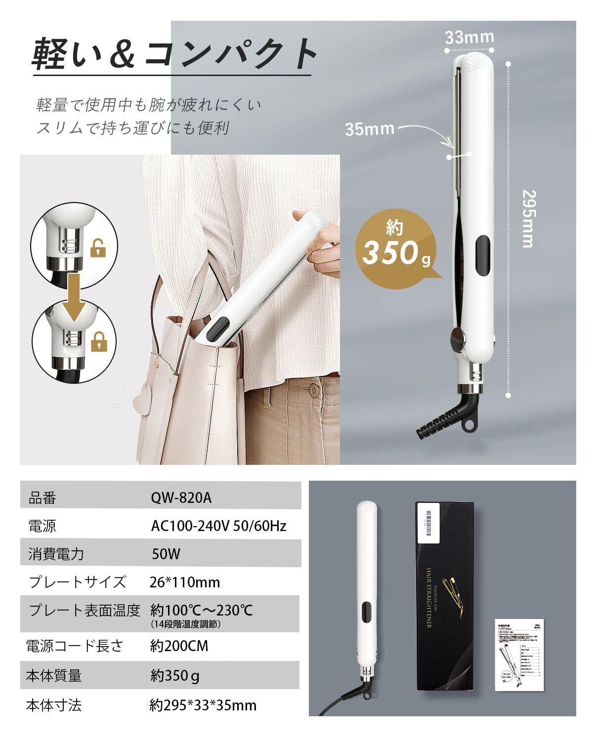 【ワンタッチロック・自動電源OFF機能】アイロン部を閉じた状態でロックでき、持ち運びラクラクです。電源をつけてから60分経つと電源が切られる自動OFF機能搭載、消す忘れの心配なしです。360度回転式のコードで使用中にコードが絡まりにくい、使いやすいです。アイロンの凹側にボタンがあるので、セットしている最中に誤ってボタンを押してしまうこともありません。