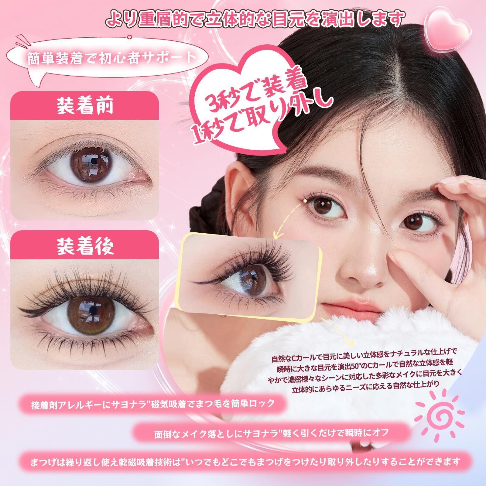 【再利用可能&刺激なしで快適】マグネット式つけまつげは、軽量で抗菌性のある清潔な素材を使用しています。接着剤なしで、まつげを自然に引き立て、快適に装着できます。何度でも使えるので経済的で、毎日の美しさを維持しながらも、刺激のない快適な装着感を提供します。従来のつけまつげの煩わしさを解消し、手軽に美しい目元を楽しむことができます。
