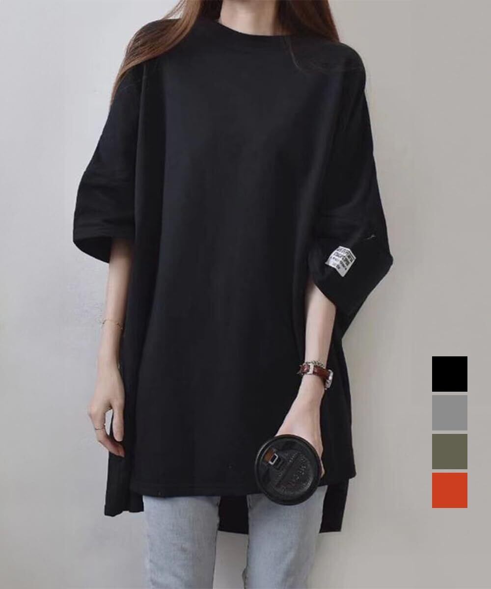 [UMIYI] ビッグTシャツ 五分袖 オーバーサイズ ロンT テールカット クルーネック カットソー チュニック トップス 長め丈 ボリューム袖 シンプル ゆったり 体型カバー 大人 カジュアル プルーオーバー