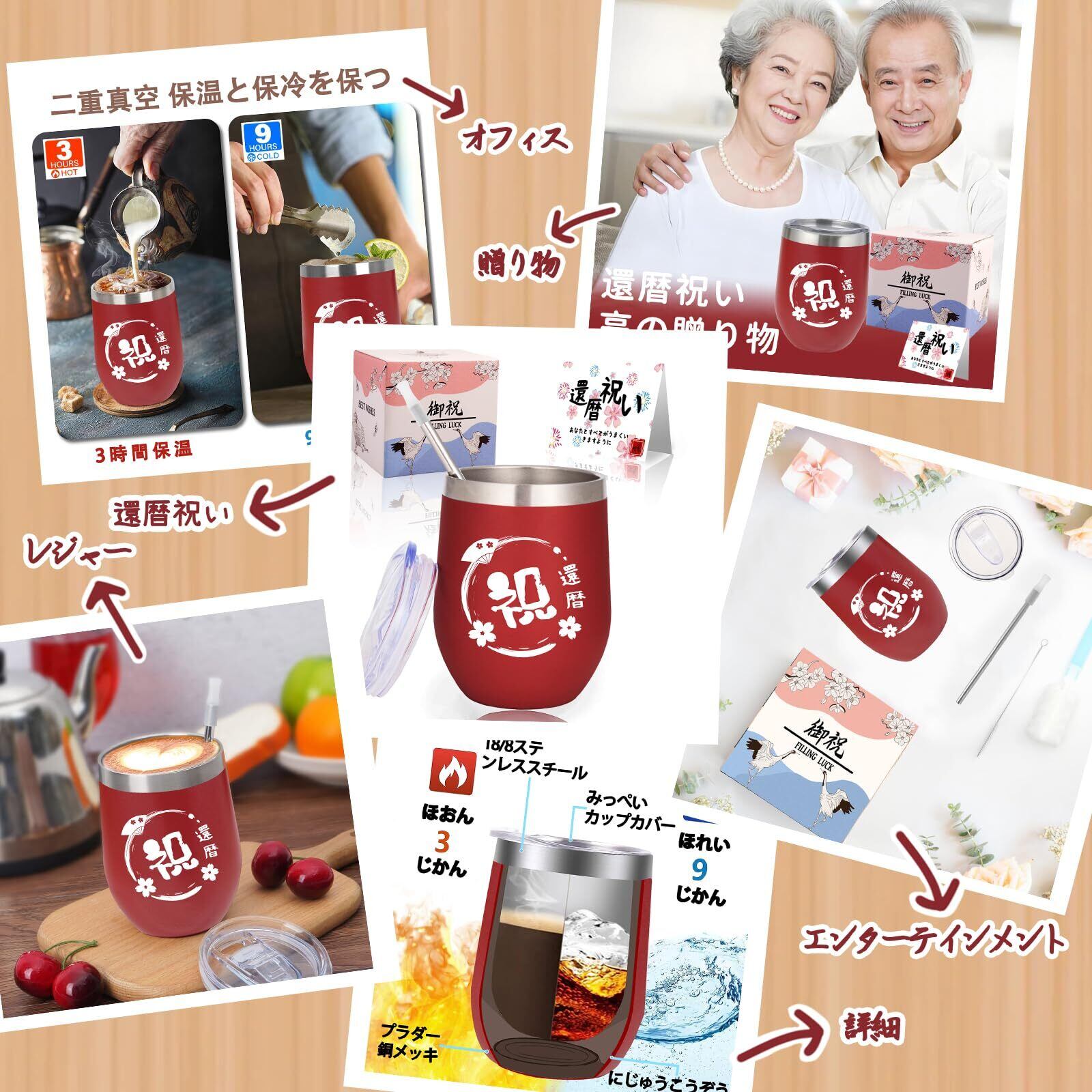 FILLING LUCK 還暦祝い 敬老の日 プレゼント 60歳 男性 女性 タンブラー プレゼントランキング 定年退職祝い 喜寿 長寿祝い ギフト 密閉ふた付き 蓋付き ステンレス サーモス ふた付き 保温保冷 真空断熱 贈り物 祝還暦 350ml
