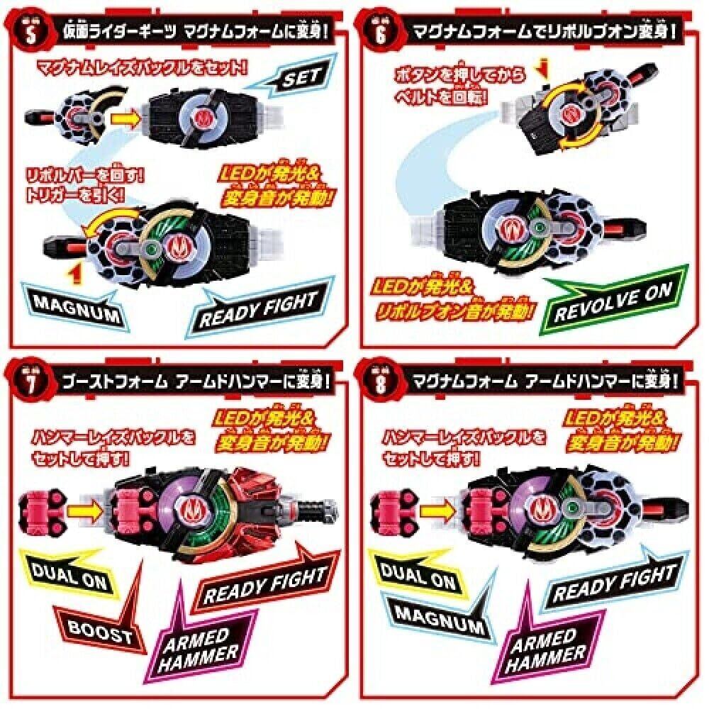 それぞれ異なる操作ギミック搭載のレイズバックルでベルト遊びをカスタマイズ。さらにベルト回転ギミックでリボルブオン変身遊びが楽しめるなど、遊び満載の変身ベルトです。
