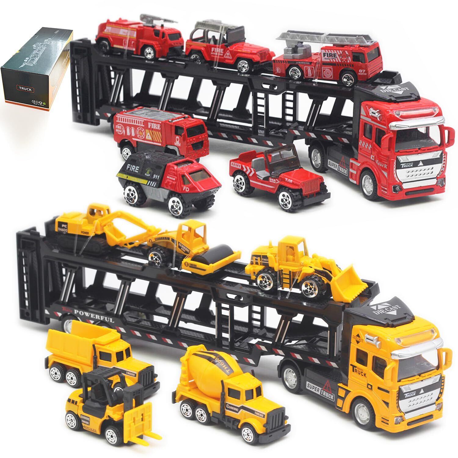 【車両を好きな子どもに最適】色々な作業車が付いているため車好きの男の子なら大喜び間違い無しです。キャリアカーのオモチャ。ショベルカーやブレンダーなど身近な車両からロードローラーなど普段はあまり見かけない車両もあります。 また、消防車やはしご車など、6台の消防作業車両 が付いている。どの車も非常に精密にできていて、素晴らしい。見た目だけではなく、動きも実際の車両と同じ動きができ。いろいろな車があるから楽しめます。