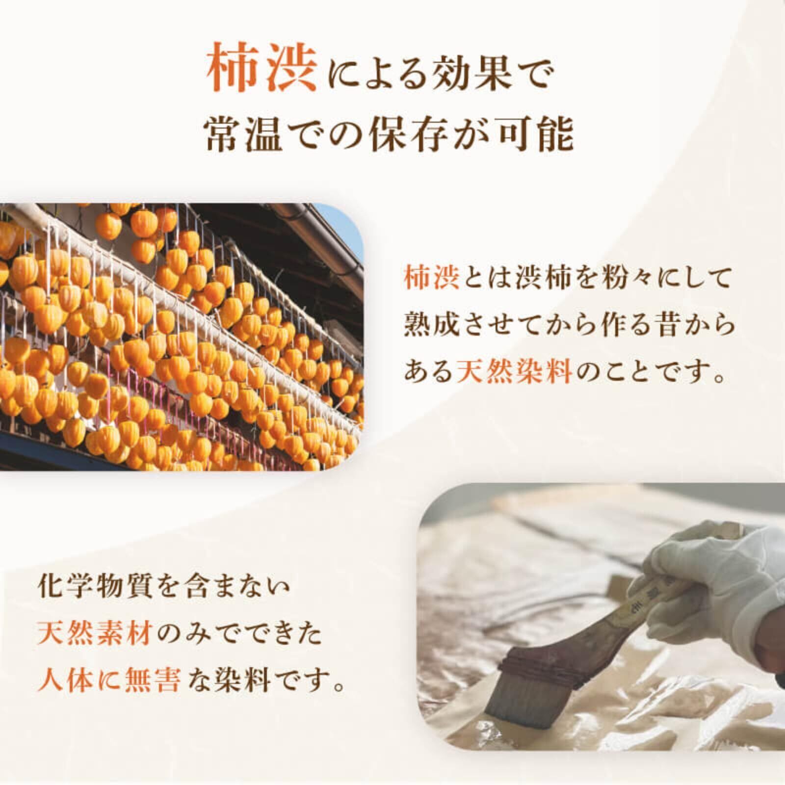 【天然柿渋の力】お米の鮮度を長くキープ…天然柿渋に含まれる「防虫・抗菌・防腐・防臭」の4つの作用で、常温でもお米をしっかりと守ります。防腐剤や添加物を使わず、安心して長期保存が可能です。