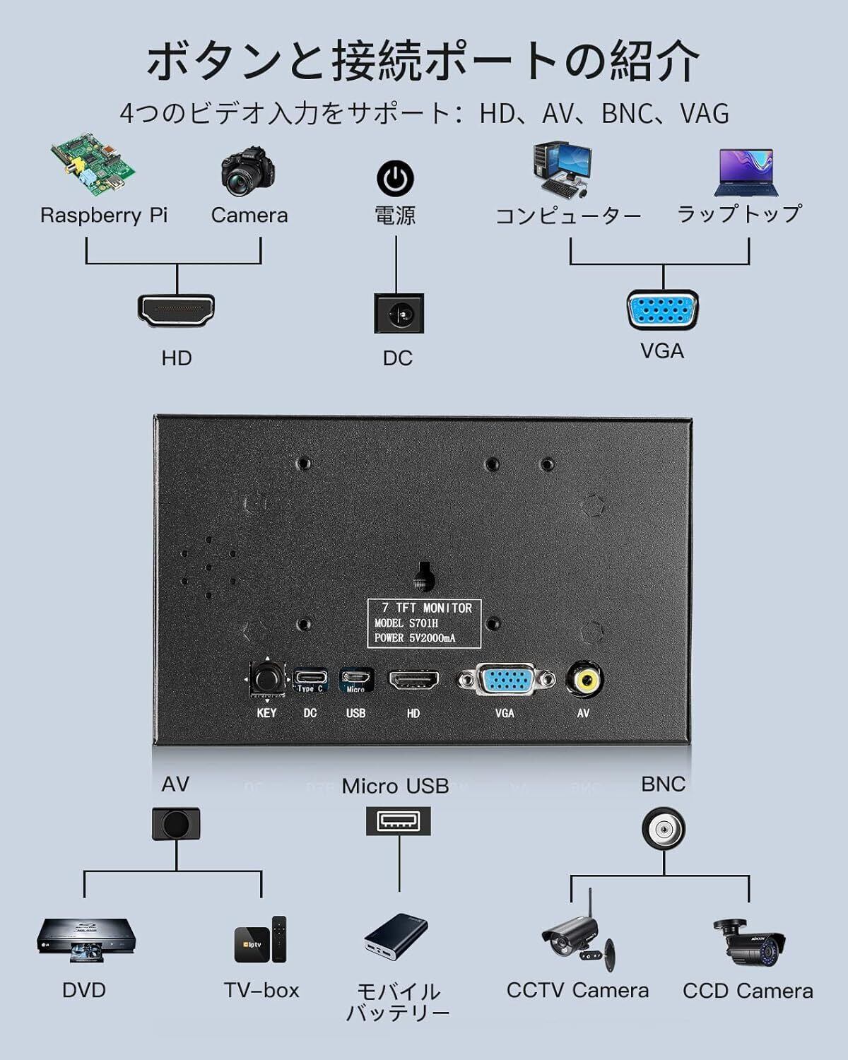 Eyoyo 7インチ 小型モニター 1024x600解像度 IPSパネル USB給電可 対応 HDMI VGA AV BNCポート Ras Pi ミニ ゲームモニター 監視カメラ用/DSLR/PC/DVD ラズベリーパイ 4/3/2 Model B対応 日本語 車載 小型ディスプレイ