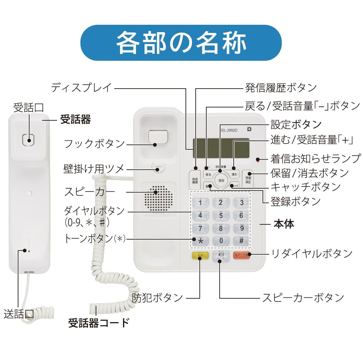 オーム(OHM) 電機 電話機 子機なし ナンバーディスプレイ対応 迷惑電話対策機能 警告音声再生 着信拒否 電話番号登録 シンプルホン 親機のみ ホワイト TEL-2992D 05-2992
