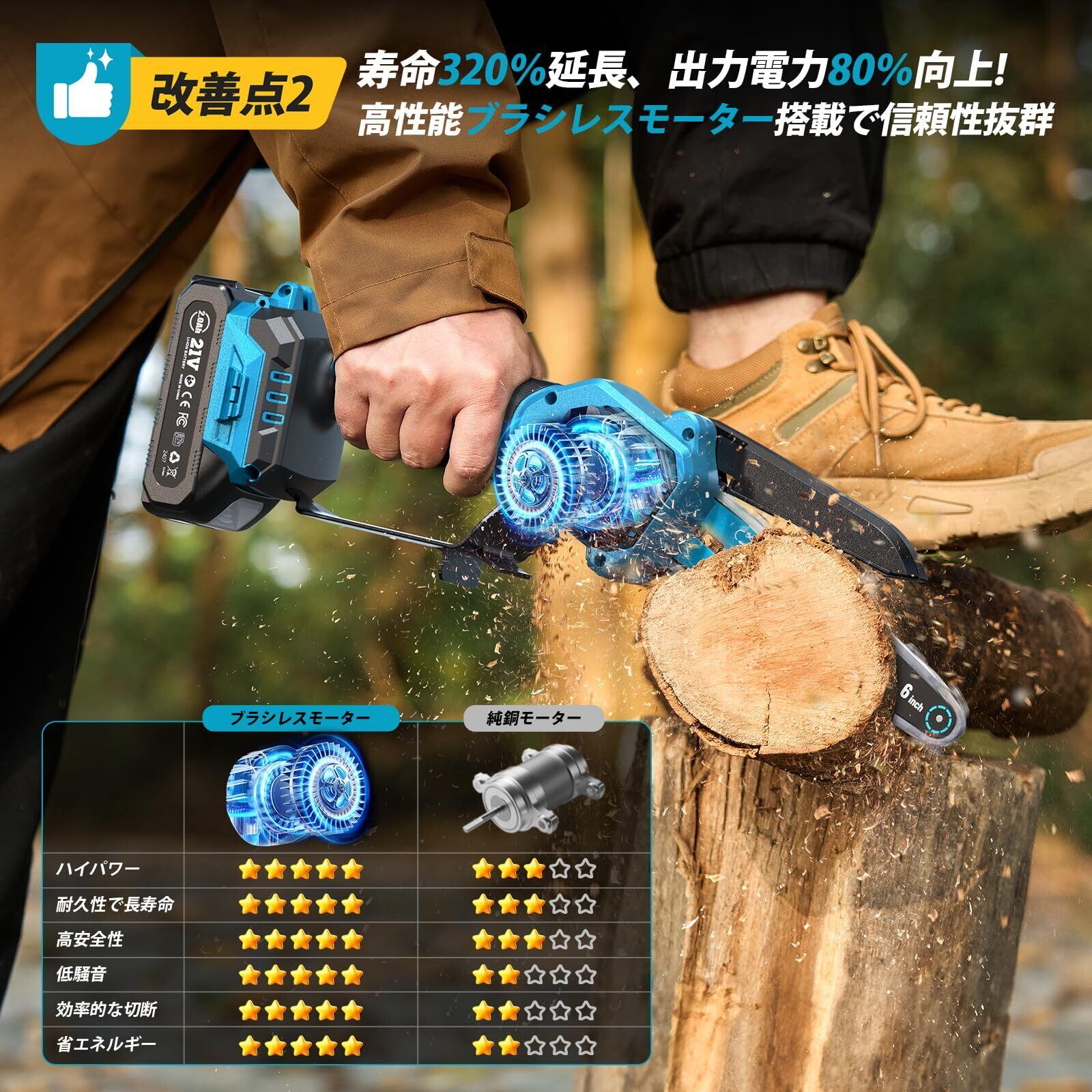 ️【ブラシレスモーター搭載 高効率6インチ充電式チェーンソー】SEESII M6Gはブラシレスモーター搭載で、従来モデルより寿命320%延長、出力80%アップ、消費電力50%カットを実現。火花や摩耗を抑え、高耐久・高効率を誇ります。オイルタンク非搭載でオイル漏れの心配なし。手動注油によりチェーンの潤滑を確実にし、油ポンプの詰まりや漏油トラブルを回避します。