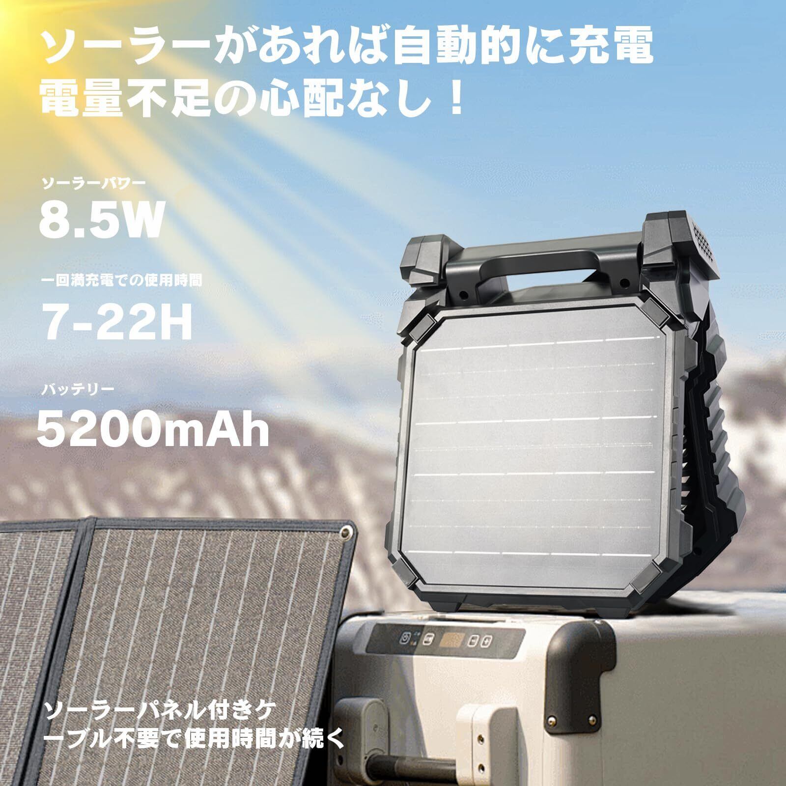 【ソーラーパネル充電】2025年の新モデルでは、ソーラーパネルの出力が8.5Wにアップグレードされ、充電速度が大幅に向上しました。アウトドアなど電源がない場所では、太陽があれば、涼しい風を続けて楽しめ、電力不足の心配がない!ソーラー充電しながら扇風機を使用することが可能です。