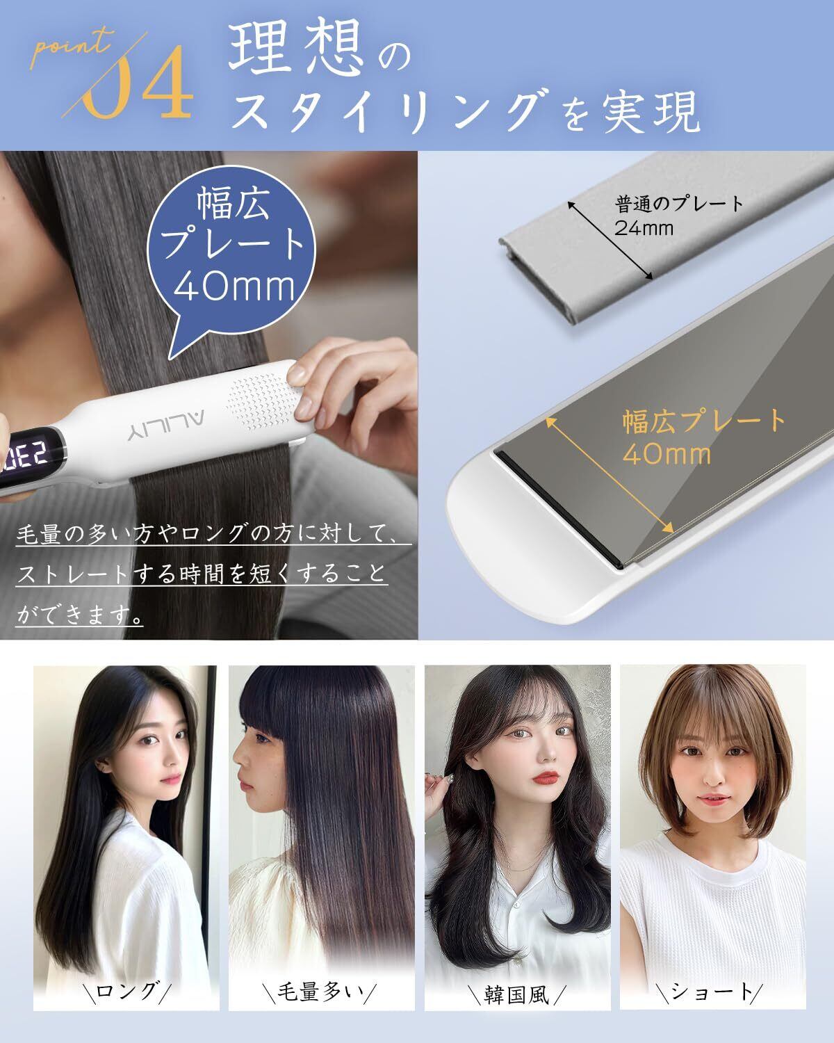 【チタンヘアアイロン&3Dクッションプレート】Aliliy ヘアアイロンは鏡のようなミラーチタニウムプレートを採用し、滑りやすさと熱伝導性の高さによって、熱や摩擦によるダメージを抑えながら、ツヤと潤いのある髪に仕上げます。また、従来製品より3倍滑らかなプレートを搭載することで摩擦による髪のダメージを抑えます。滑らかなプレートで髪が引っ張らない。また立ち上がりが速い(180℃の場合約25秒)、忙しい朝でも時短スタイリングを可能です。上下自由に動く3Dクッションプレートでどんな方向からも均一に力が入るので、自然に綺麗なストレートになります。更に耐久性に優れているので、長期間使える点も魅力です。