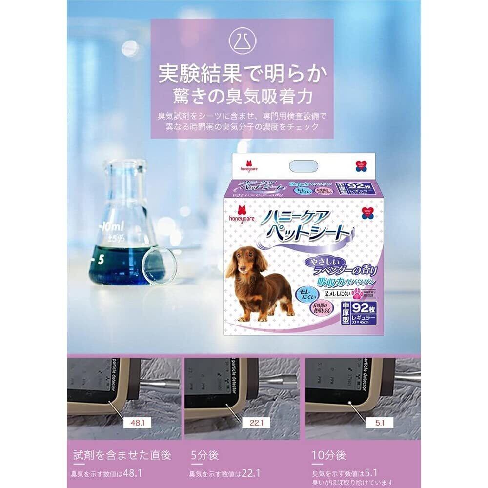 本商品「ハニーケア ペットシーツ ラベンダーの香り付き」は中厚型で、多層構造を採用したため、オシッコをたっぷり吸収いただけます。