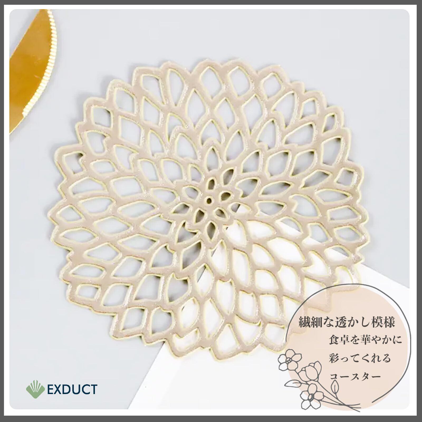 繊細な透かし模様で食卓を華やかに彩ってくれるコースターです。耐久性にすぐれ、薄手で柔らかく、汚れてもさっと拭いてすぐに使えるのが特徴です。