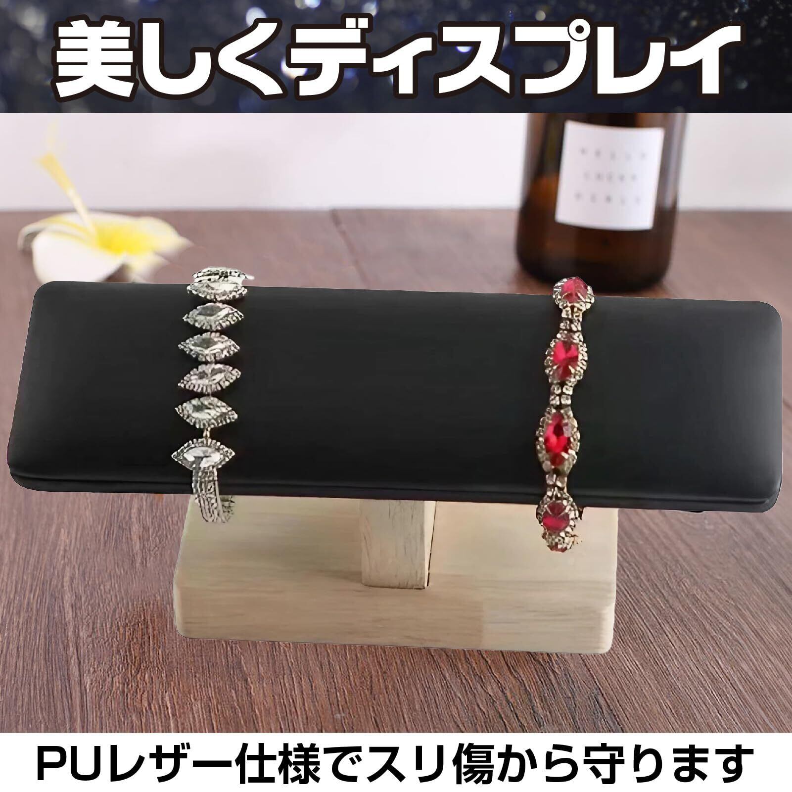 ジュエリースタンドは、お気に入りのブレスレットや腕時計をディスプレイしながら収納したいあなたにおススメ。ナチュラルウッドの台座、T型クッション。ブラックPUレザー仕様。2個セットです。