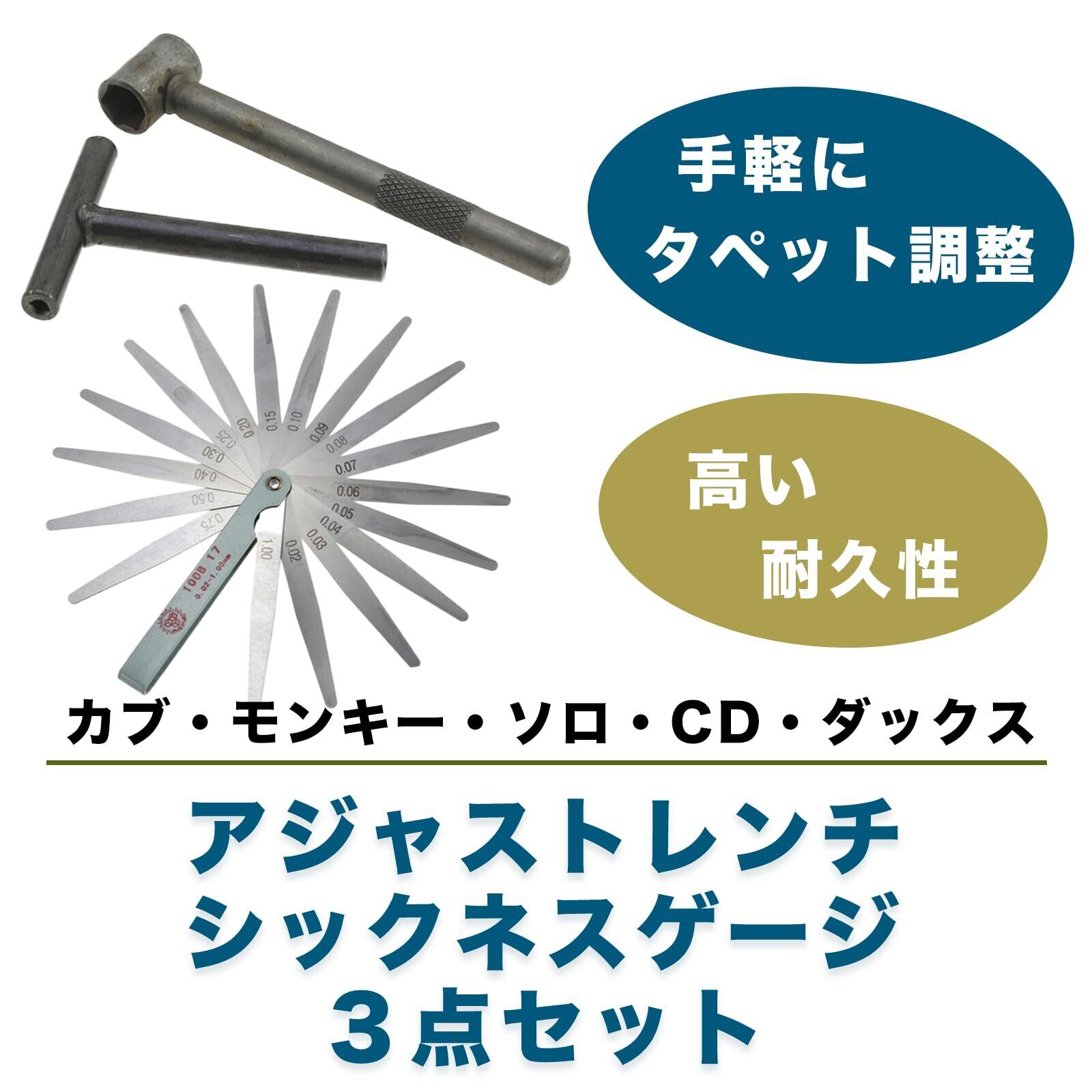 "アジャストレンチとシックネスゲージ3点セット!バイク 横型エンジン (カブ・モンキー・ソロ・CD・ダックス)のタペット調整を効率化させる為のアジャストレンチ・バルブクリアランス調整レンチ、正確に調整する為のシックネスゲージのセットになります。工具の効率と精度を追求したエンジニアリングの逸品。バイクや自動車整備におけるタペット調整作業から自転車メンテナンスまで、ワンランク上の作業が可能になります。コンパクトなサイズで持ち運びに便利。まさにポータブルエンジニアリングの傑作です!