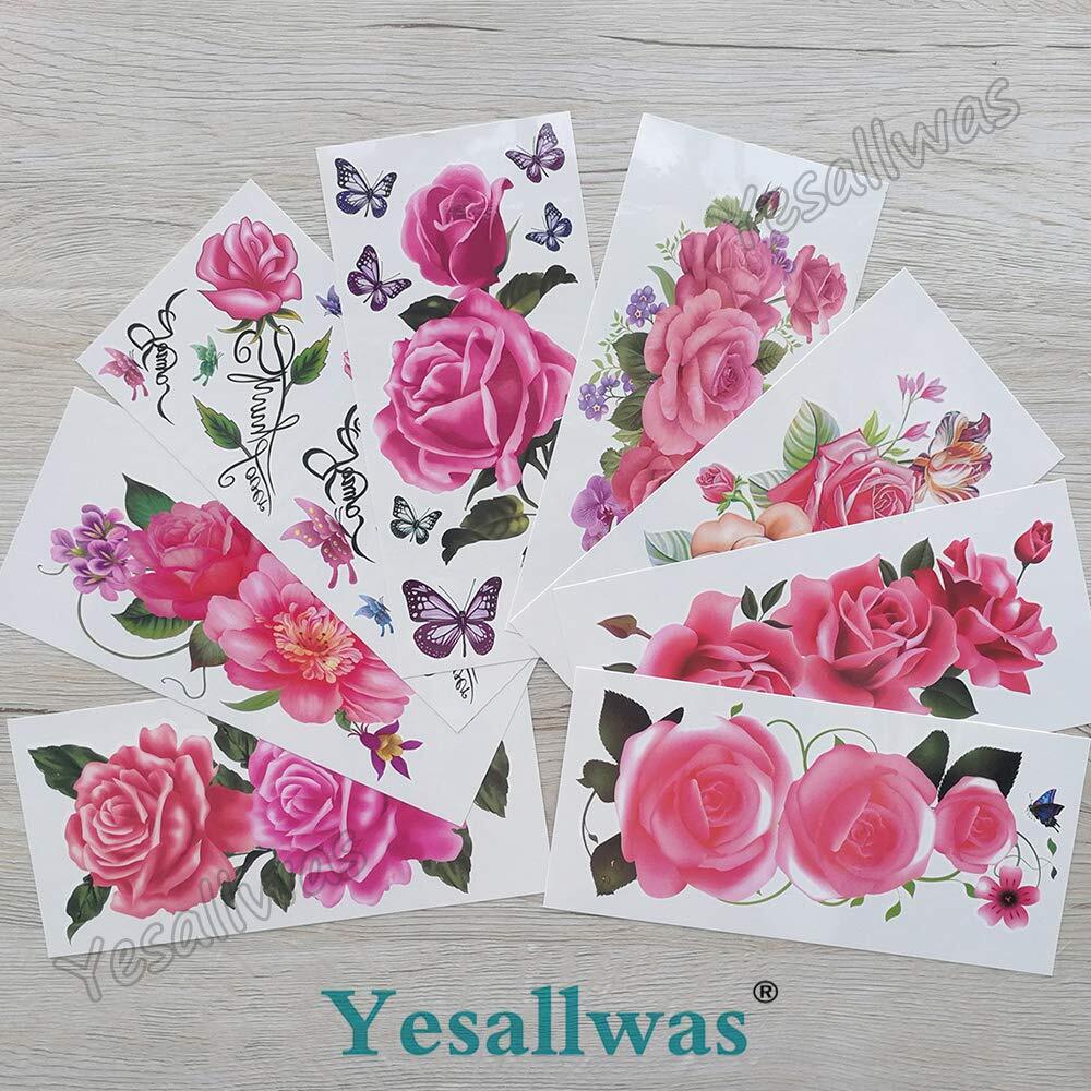 Yesallwas タトゥーシール 薔薇 青 ブルー 花 8枚セット 紫 バラ ロース おしゃれ 防水 長持ち 入れ墨シール 腕 足 胸 女性 レディース タトゥーステッカー ボディーシール 刺青シール blue Rose tattoos sticker 9x19cm (ピンク)