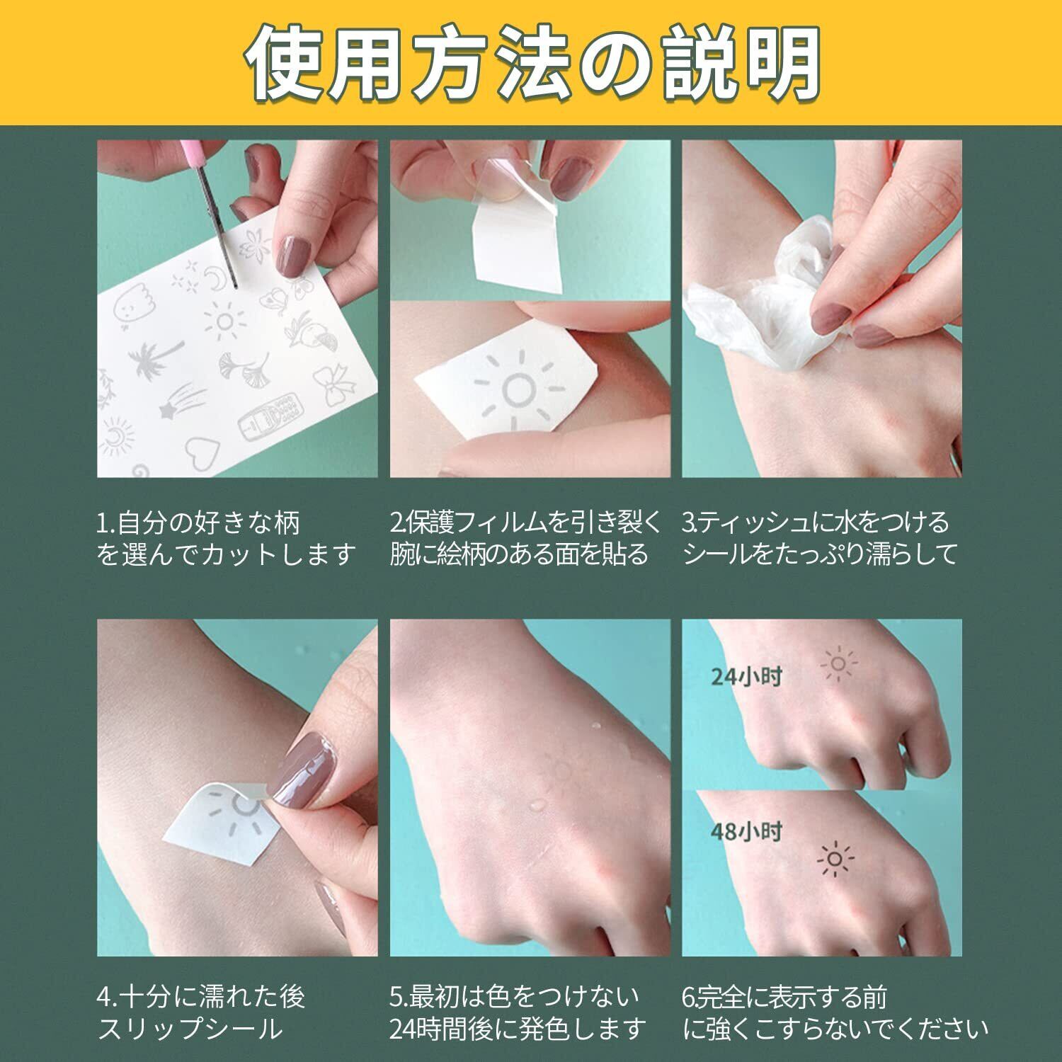【貼り付け方法】1、付けたい柄を切り取ってください、貼る前は肌を整え、油分を取り除いてください。2、上の透明の保護フィルムを外し、柄のあるサイドを貼り付けたいところに軽く押し付けてください。3、水を含んたタオルやスポンジをシールの上に置く、台紙を濡らしてください、20~30秒を待つ。4、確認をしながら台紙ゆっくり剥がして、出来上がりです。5、塗ったばかりの時はあまり色が出ませんが、24時間程度で色が出ます。