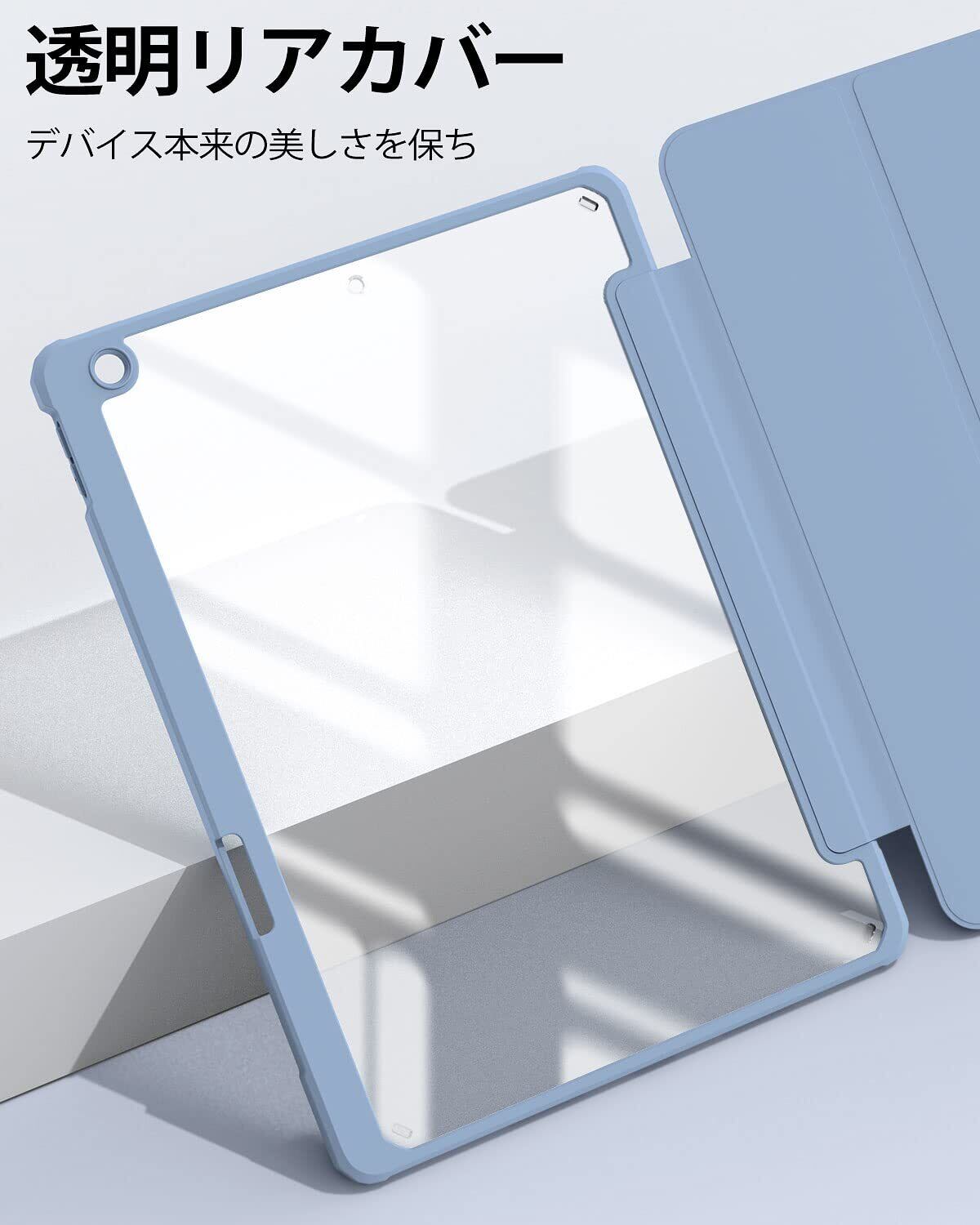 【材質&外観】ケースの表面はPUレザー素材を利用して、軽量、超薄を備えます。透明バックカバーの枠は柔軟な TPUを採用して、取り付けも簡単にできます。軽量のソフトシェル設計により、シェルの体積を増やすことなく保護を向上できます。電源ボタン、音量ボタン、スピーカー穴等、iPadを隅々までカバーし、非常に優れた保護力を発揮。フロントカバー内部材質はマイクロファイバーで、摩擦によって発生する傷を抑え、液晶画面を保護しきれいに保ちます。(注:透明部分の表裏の保護フィルムを剥がしてください)