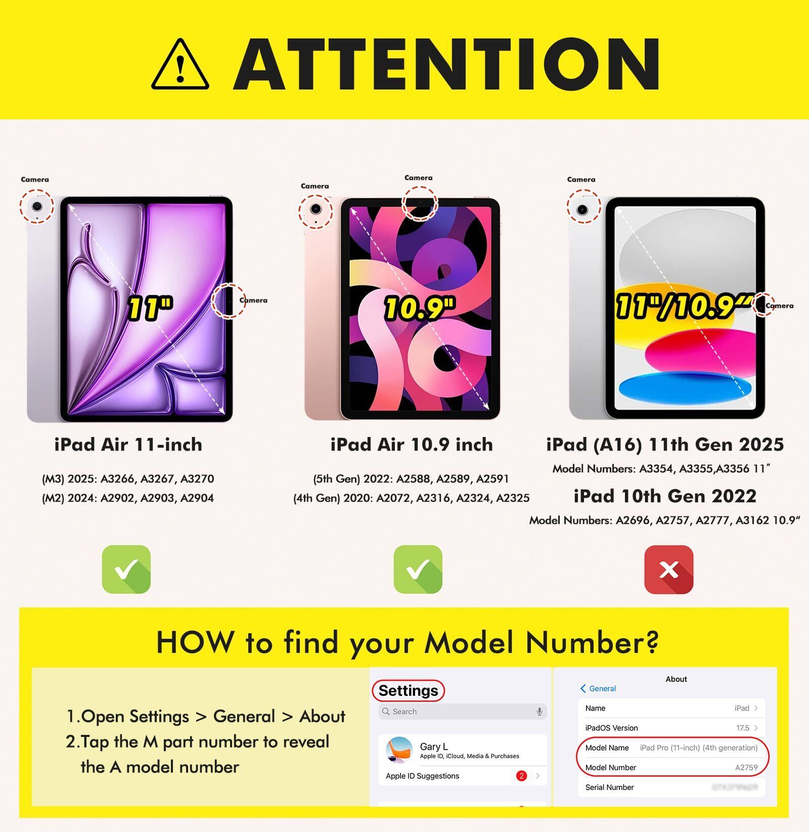 対応機種:Apple iPad air 11インチ M2 2024/M3 2025 & iPad Air 第5世代 2022年発売 (型番:A2588/ A2589/ A2591) & iPad Air ケース 第4世代 2020年発売 10.9インチ (モデルA2072/23166)のみに対応。 /2324 /2325) 他のiPadモデルには対応していません。 注意:iPadの背面下部に小さな印字でモデル番号「AXXX」をご確認ください。