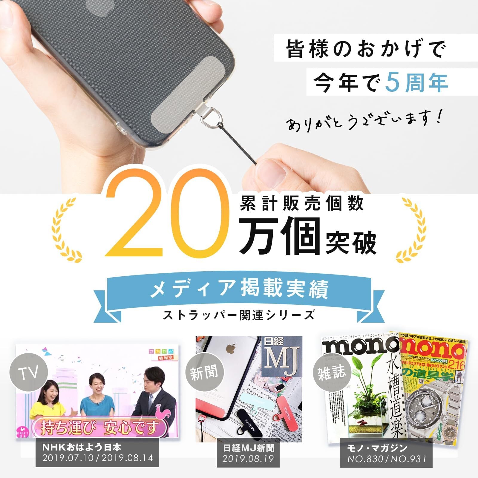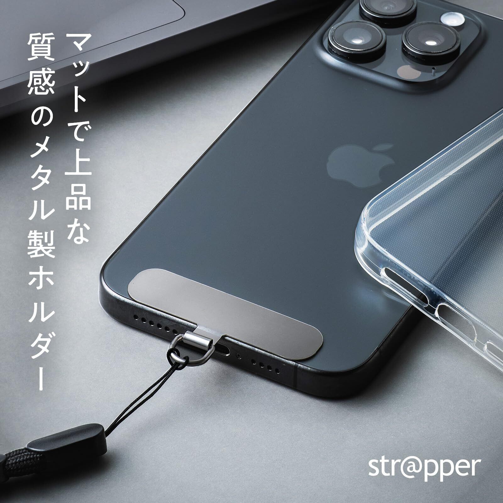 【マットで上品な質感のステンレス製スマホストラップホルダー】ストラッパーはマットで落ち着いた光沢感がスマホの色とぴったりマッチするストラップホルダーです。金属製で切れない/ちぎれないのでスマホ落下防止対策にもぴったりです。