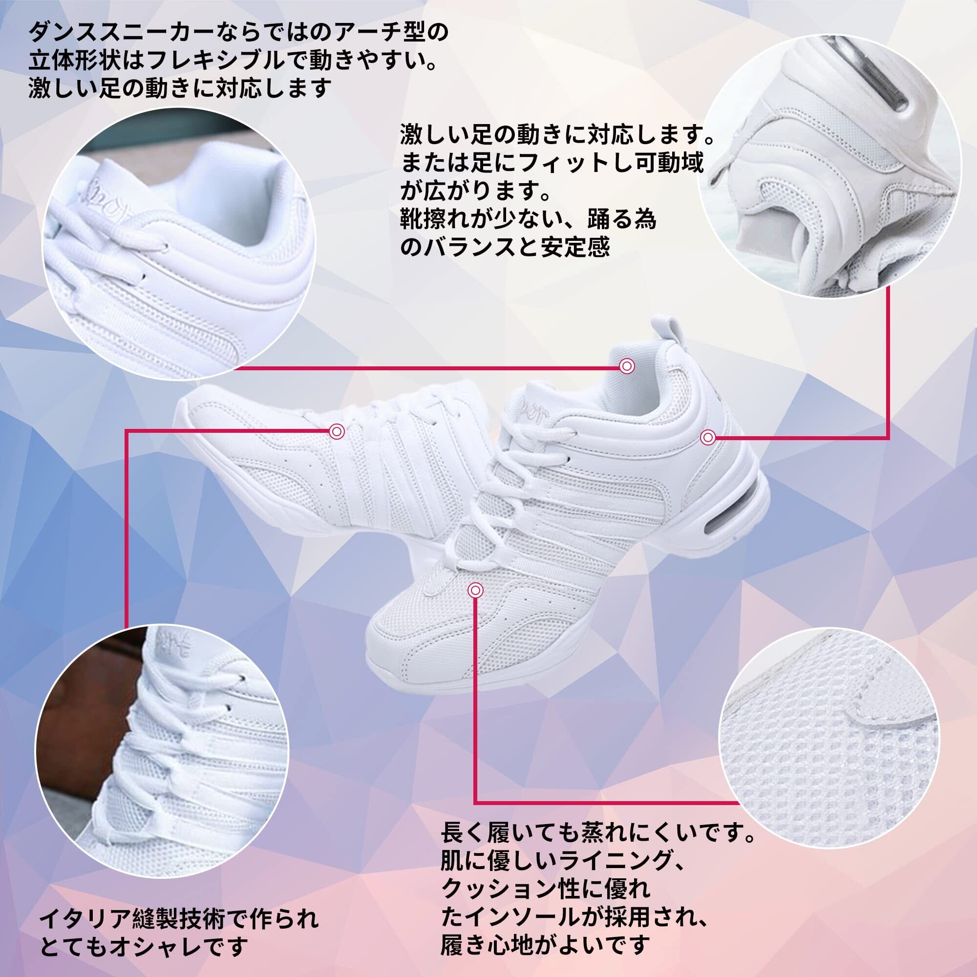 靴底が前後二つに分かれたスプリットソール、土踏まずの底がないタイプ。足にフィットしやすく可動域が広いので床をつかみやすく確かなターンとステップをサポート。靴底が強い耐摩耗性と耐曲性のダンスシュ一ズ!ダンススニーカーならではのアーチ型の立体形状はフレキシブルで動きやすい。激しい足の動きに対応します。または足にフィットし可動域が広がります。靴擦れが少ない、踊る為のバランスと安定感。