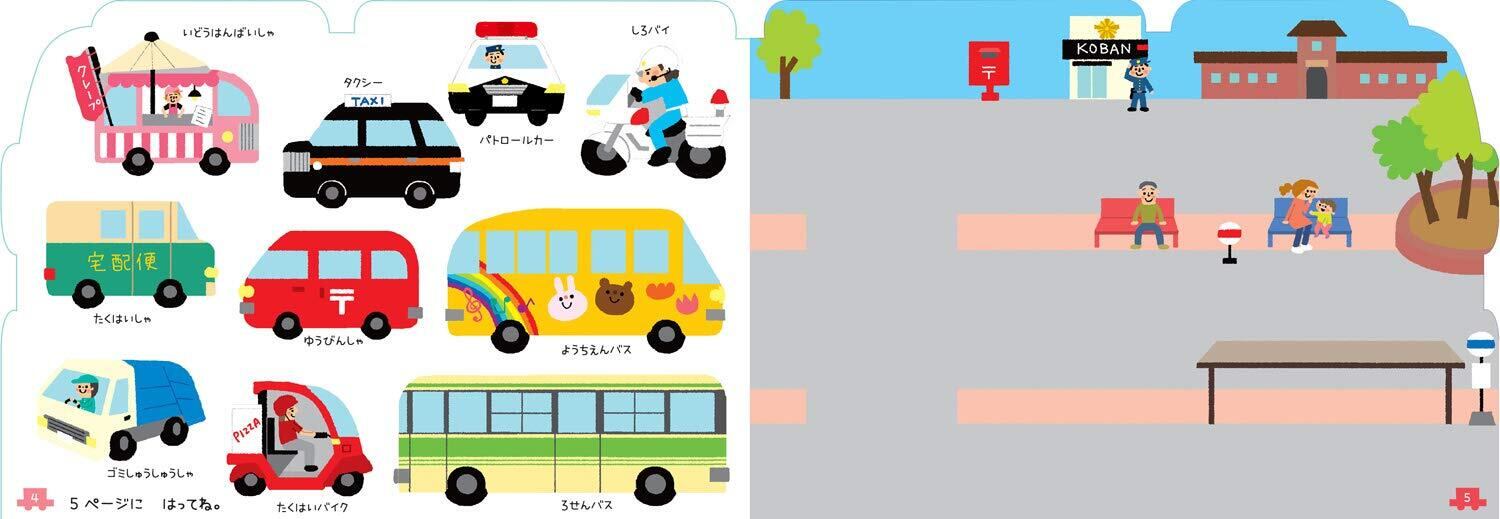 また、車にはそれぞれ「ゴミしゅうしゅうしゃ」や「こうしょさぎょうしゃ」などの名前が書いてあるので、お子さまといっしょに遊びながらものの名前を覚えることができます。完成したシールブックは絵本のように読み返してくり返し遊ぶこともできます。めいろやぬりえのコーナーも楽しめます。