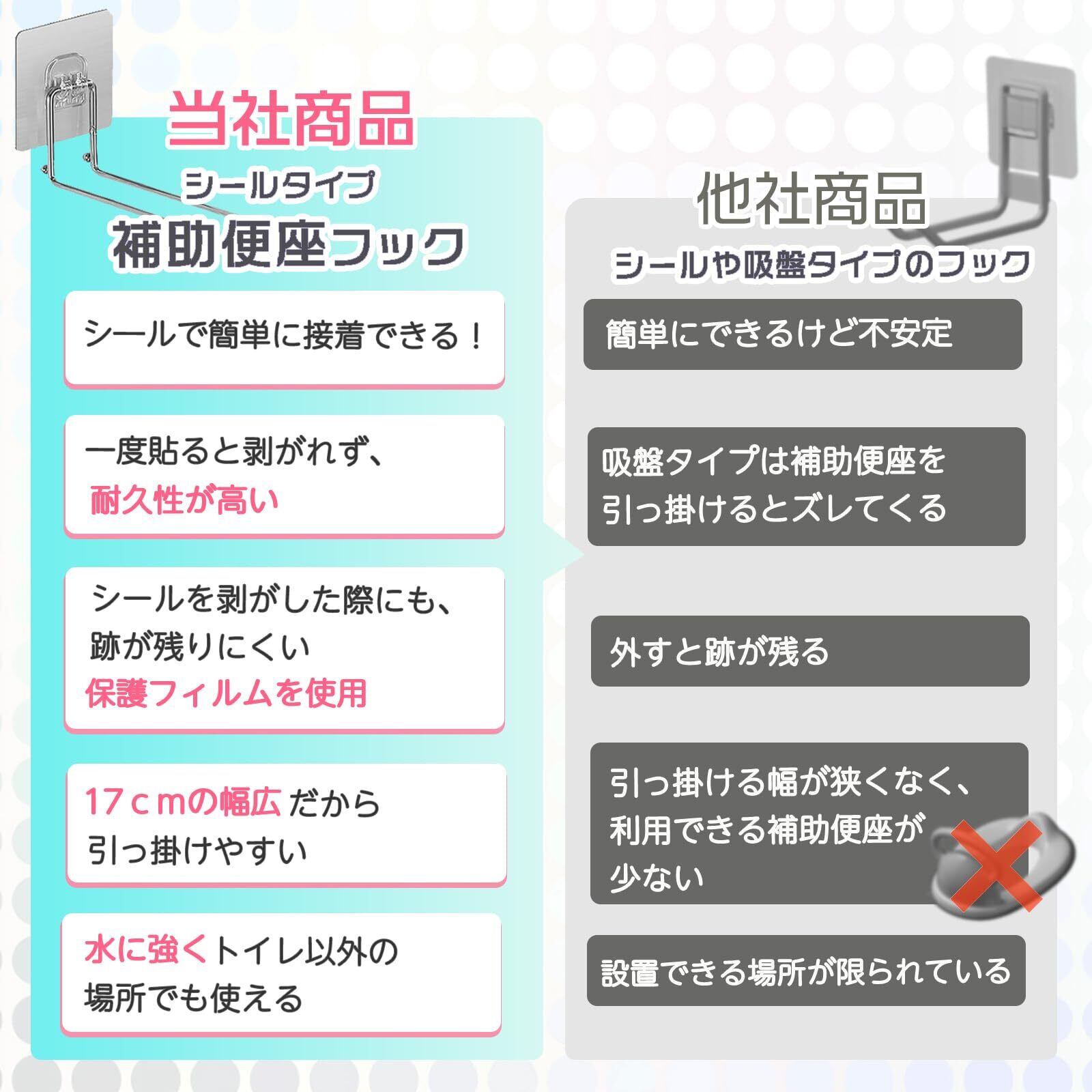 お子様のトイレトレーニングをサポートする補助便座をすっきり収納できる補助便座用の収納フックです。 この収納フックは便座の横やトイレのタイルに簡単に付着できるため、補助便座の収納場所として利用できます また、お風呂場や洗面所など、他の場所でも便利にご使用いただけます。