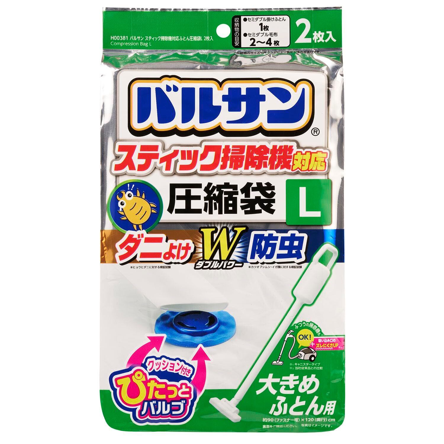 レック(LEC) バルサン スティック掃除機対応 ダニ除け・防虫加工 ふとん圧縮袋 Lサイズ (2枚入) /目安:セミダブル掛けふとん1枚/ふつうの掃除機もOK/H00381