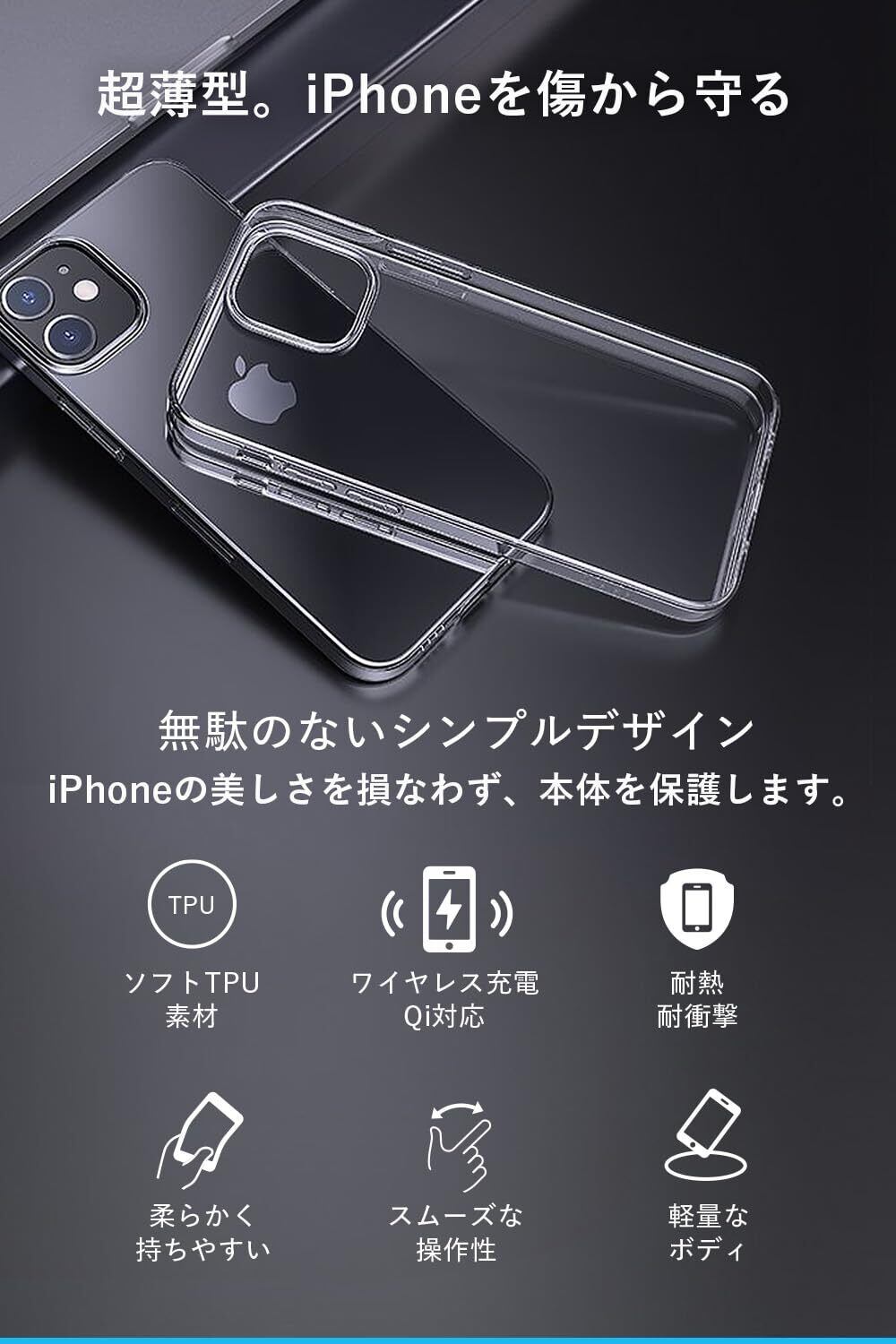 【透明TPU素材で裸のような手触り】厚さ1.5mmの透明TPU素材を使用し、軽やかな手触りが特徴のケースです。スクリーン周りは0.5mm高く設計されており、画面割れ防止にも配慮されています。透明で軽量なデザインが、アイホン 11の美しさを際立たせつつ、しっかりと保護します。