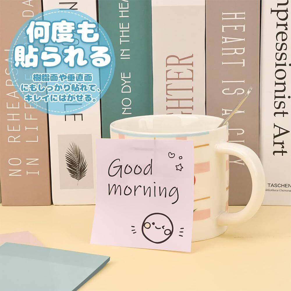 【キレイにはがせる】:クリアファイルやパソコン、電話などの樹脂面や、キャビネットや家具などのスチール面、扉、壁などの垂直面、ダンボールなど、つきにくかった場所にもしっかり貼れるので、大切な伝言やメモに最適です。何度も貼られて、粘着剤を残さずキレイにはがせます。