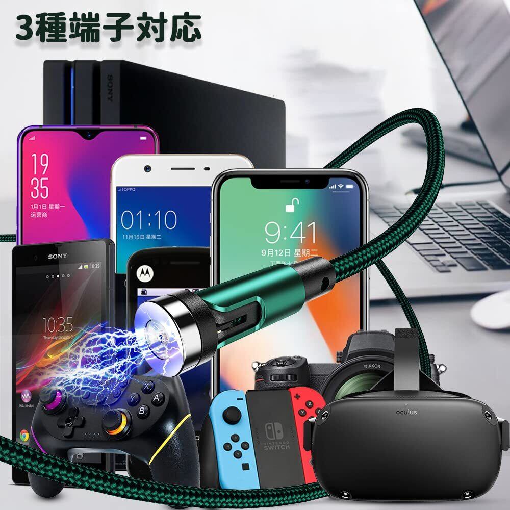 【数量限定】マグネット 充電ケーブル 【5本セット/0.5+1Mx2+2M+3M&12コネクタ】 LEDライト内蔵 USBケーブル 3in1 充電器 マグネット 540°回転可能 急速充電 防塵 USBC Micro USB Phone 全機種/PlayStation対応 ダークグリーン clenye