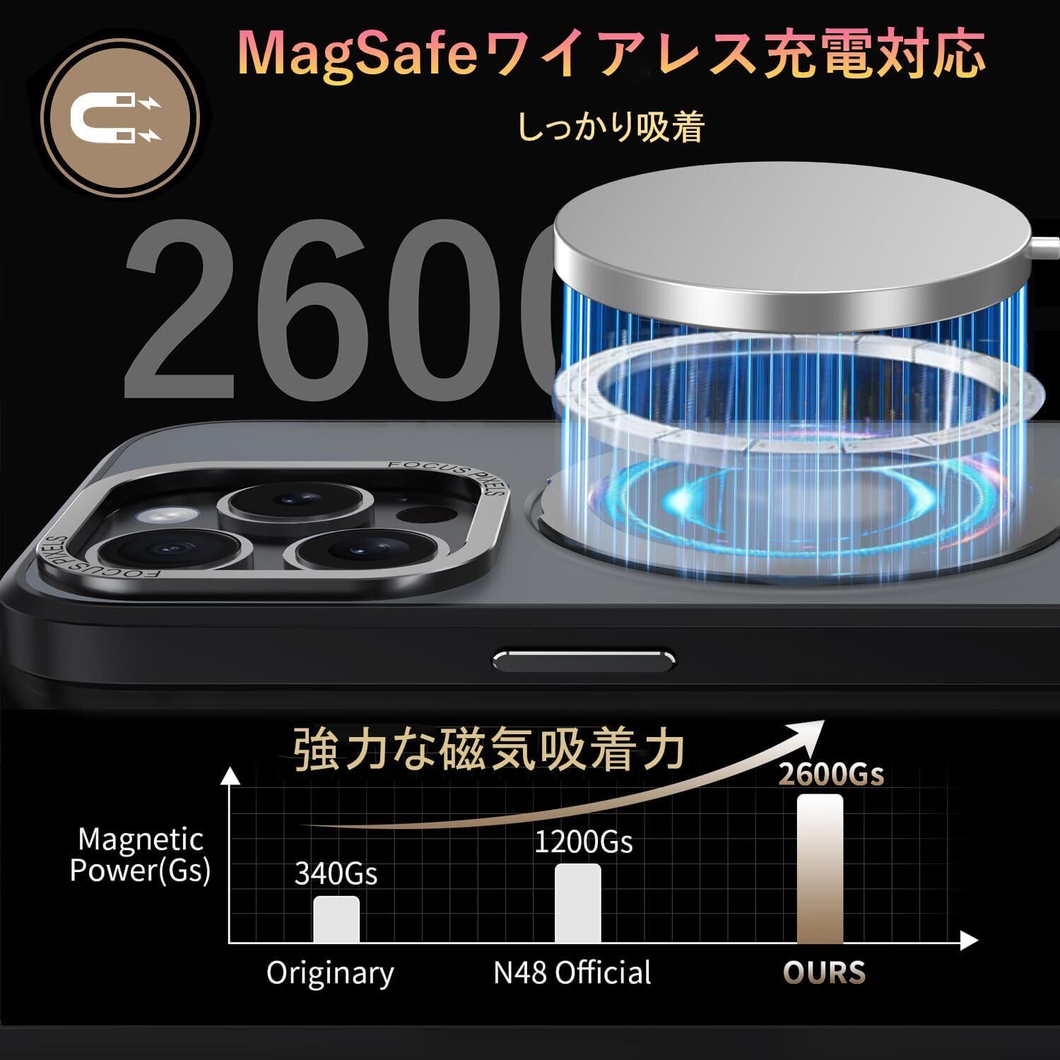 「Magsafe対応」ケースをつけたままマグセーフ機能を快適に使用できます。背面に薄くて強いマグネット内蔵しています、ワイヤレス充電や車載ホルダーやアクセサリとのあらゆる充電に安定で接着ができ、差し込みのいらないより簡単により素早く充電できます。